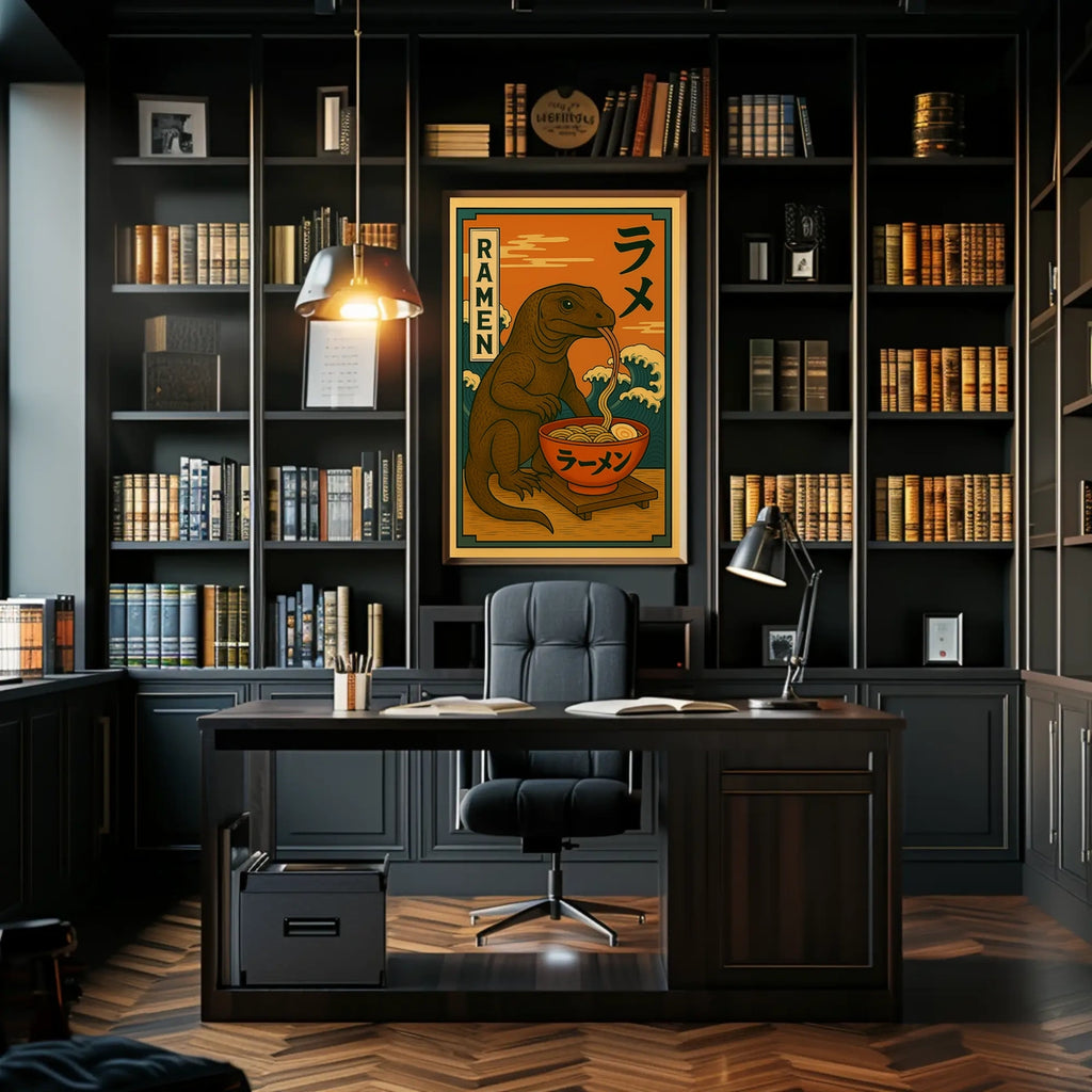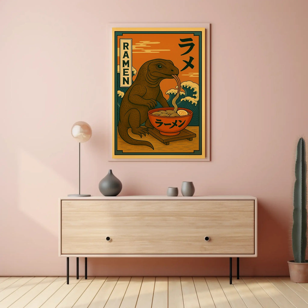 Distinctive subject matter: A playful fusion of ramen motifs with reptile-inspired scenery creates a unique focal point for any wall.