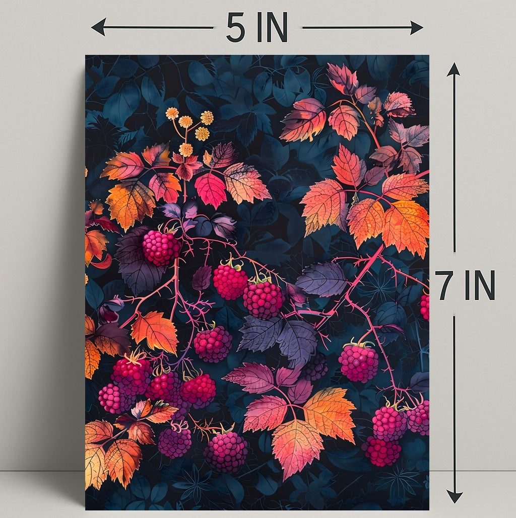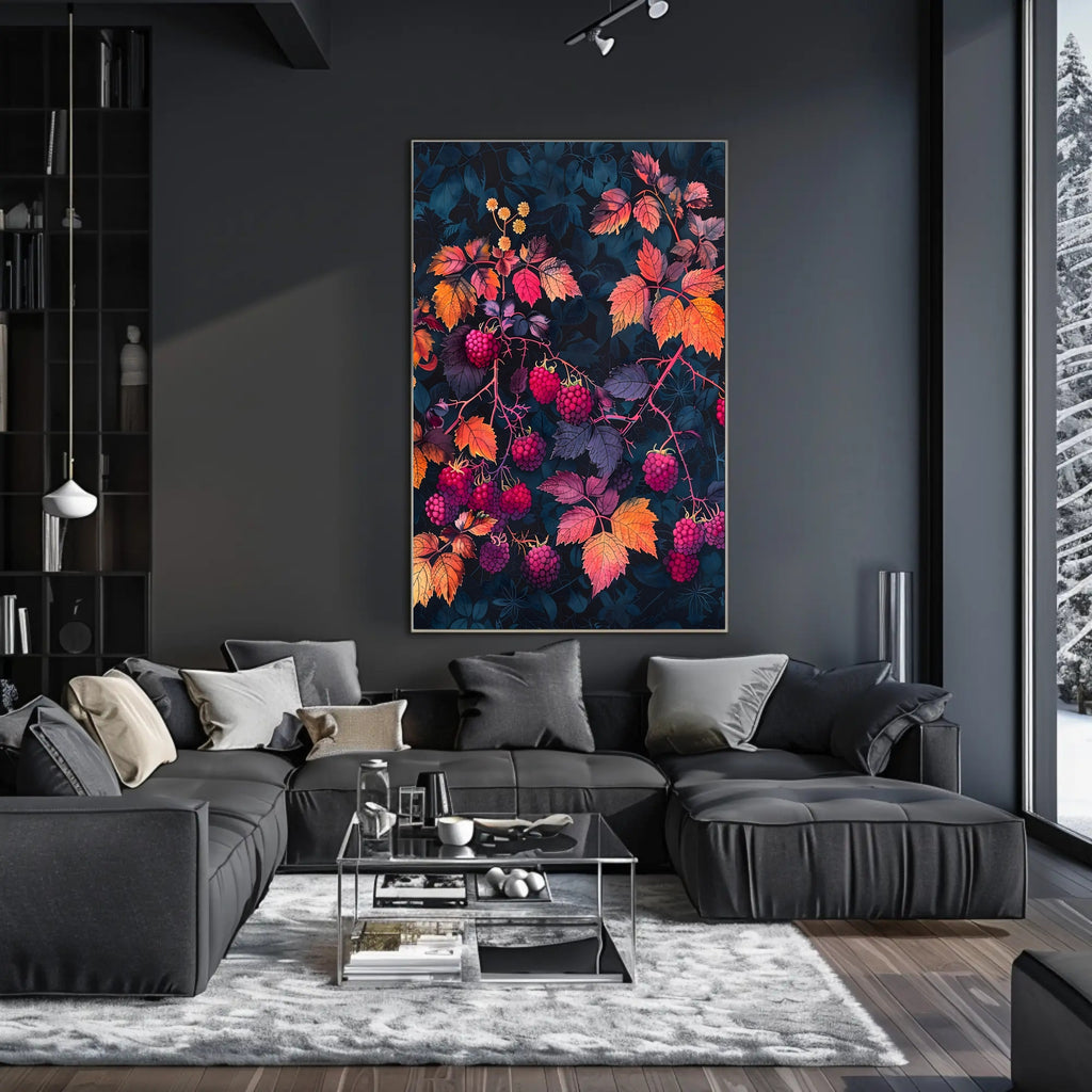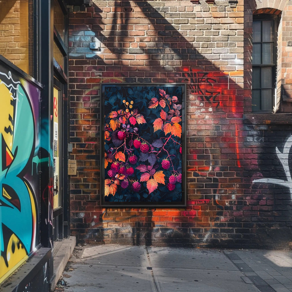 Transform your space with the stunning Raspberry Branches Illustration from PosterGoat. This exquisite poster features an artistic representation of raspberry branches, beautifully adorned with ripe berries and vibrant, multicolored leaves. Set against a dark background, this piece captures the essence of nature’s abundance and beauty, making it a perfect addition to any home decor.