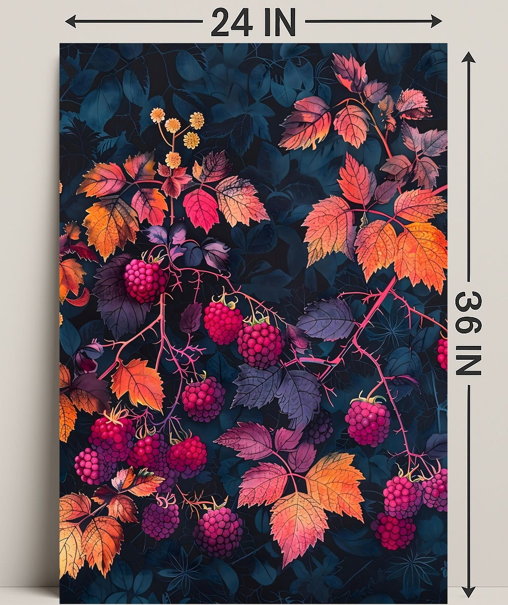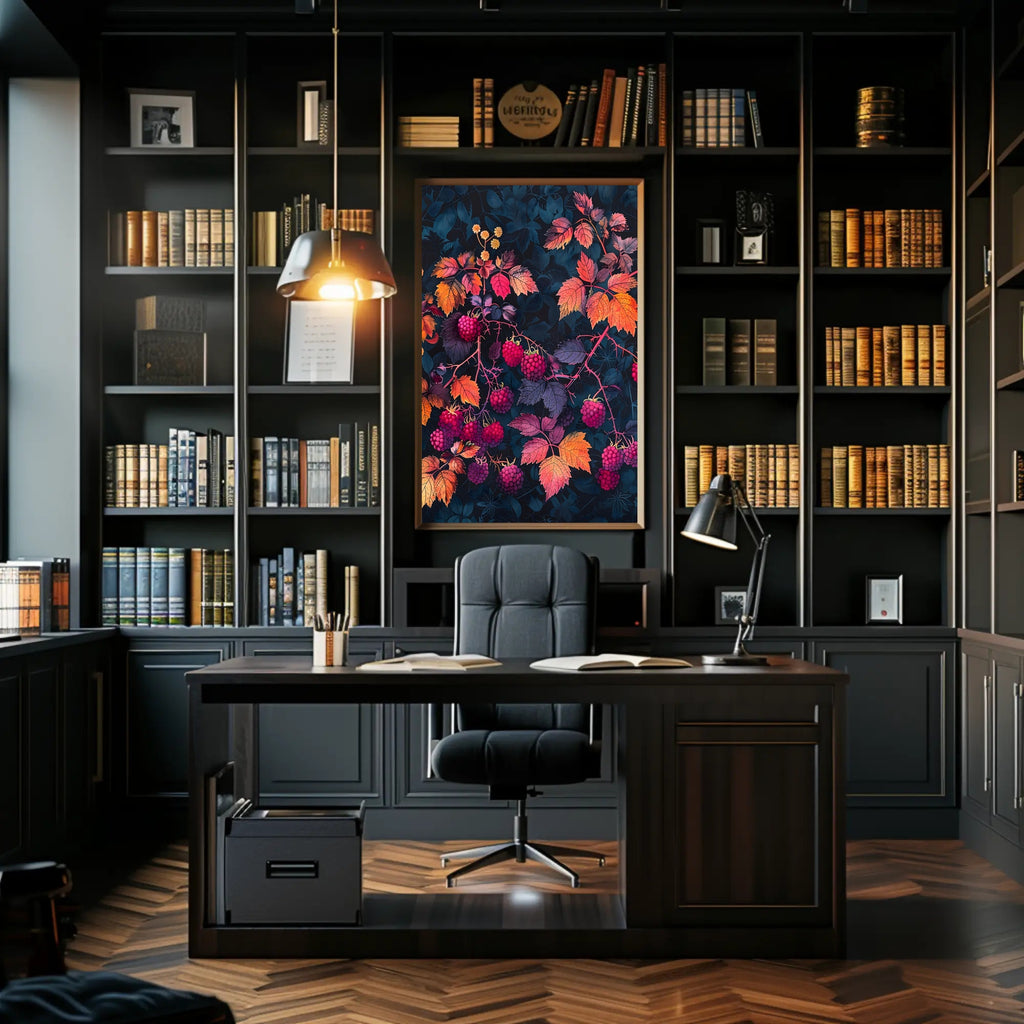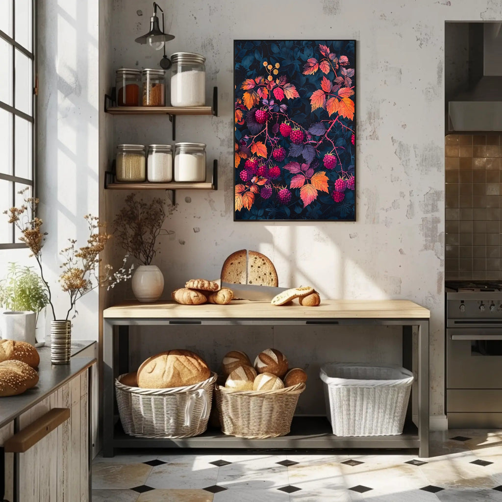 Transform your space with the stunning Raspberry Branches Illustration from PosterGoat. This exquisite poster features an artistic representation of raspberry branches, beautifully adorned with ripe berries and vibrant, multicolored leaves. Set against a dark background, this piece captures the essence of nature’s abundance and beauty, making it a perfect addition to any home decor.