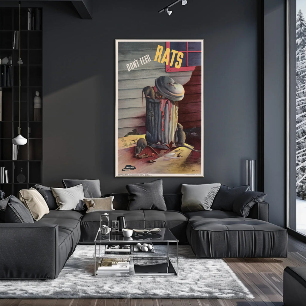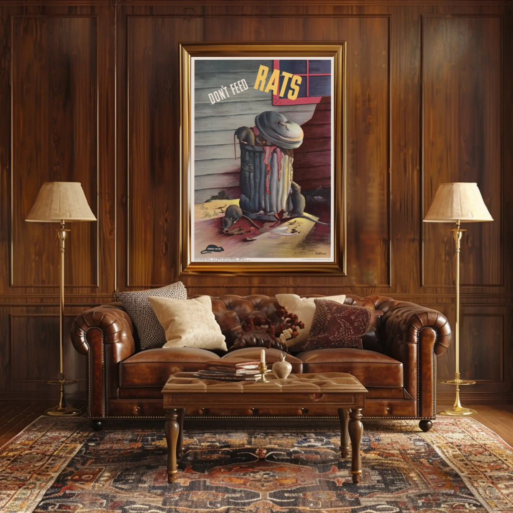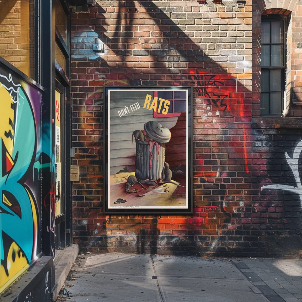 This educational poster highlights the urgent public health message of preventing rat infestations by managing waste responsibly. Set in a residential mid-20th century American neighborhood, the vintage-style design features a scene with rats foraging around an overflowing metallic garbage can. The clear and bold text "DON'T FEED RATS" underscores the cautionary tone. The illustrative style, with its vivid colors and shading, captures the attention while educating viewers about the importance of proper waste disposal. An invaluable addition to collections focusing on historical public service announcements or environmental awareness.