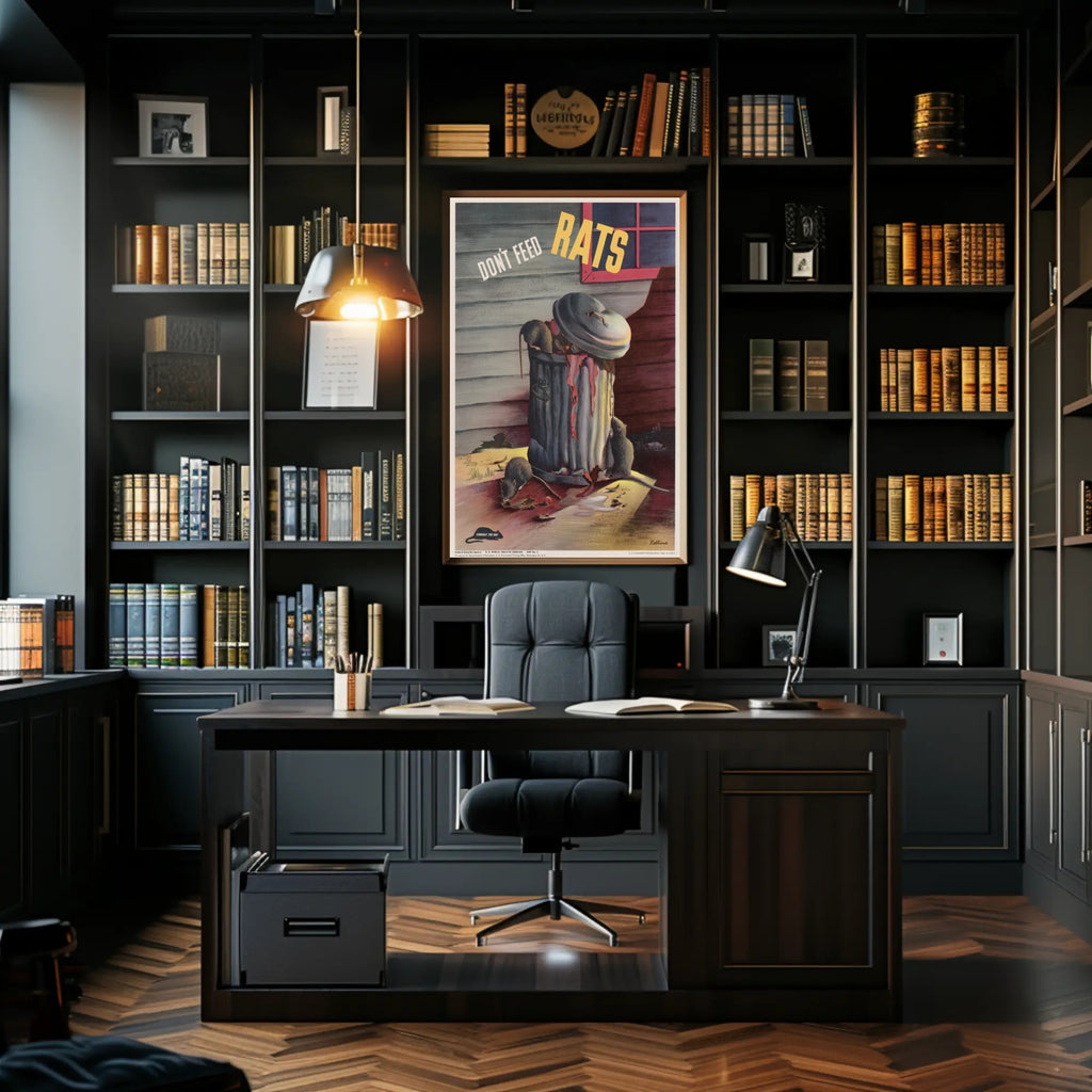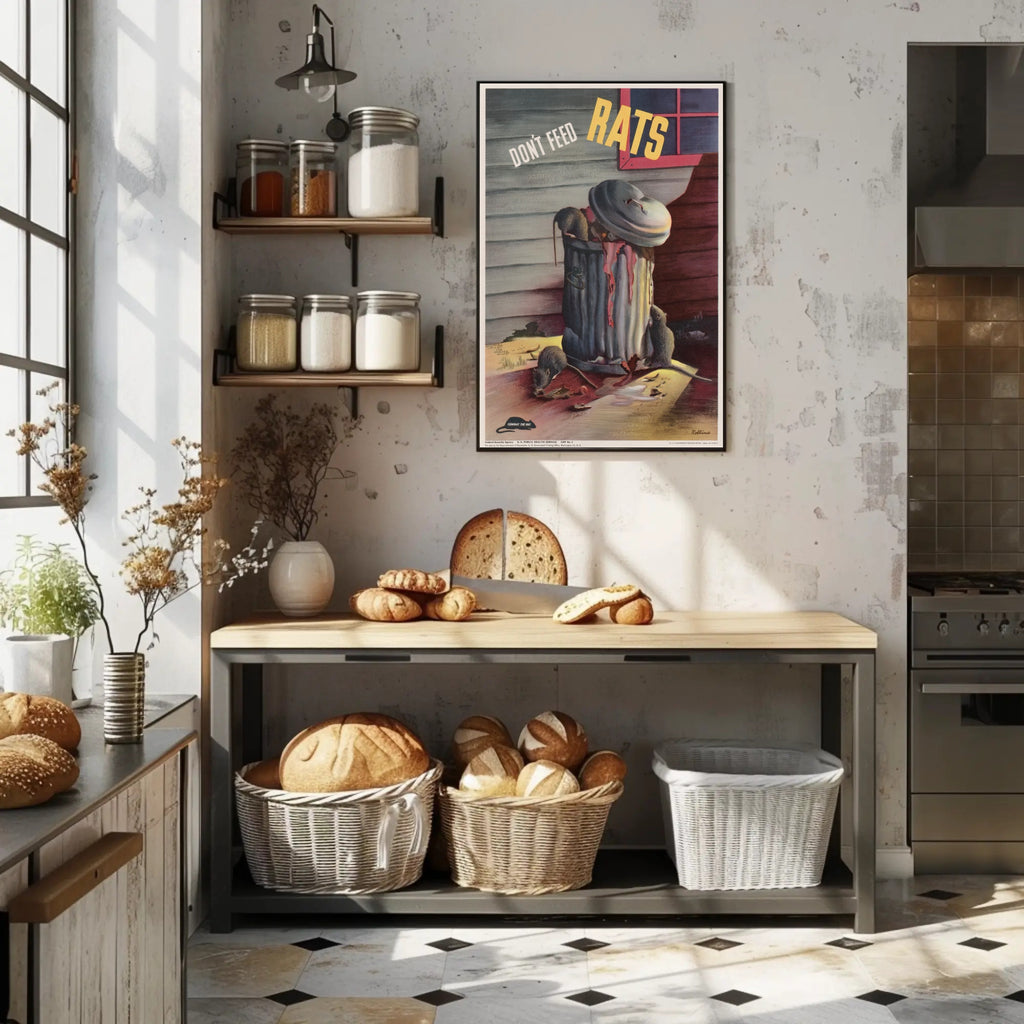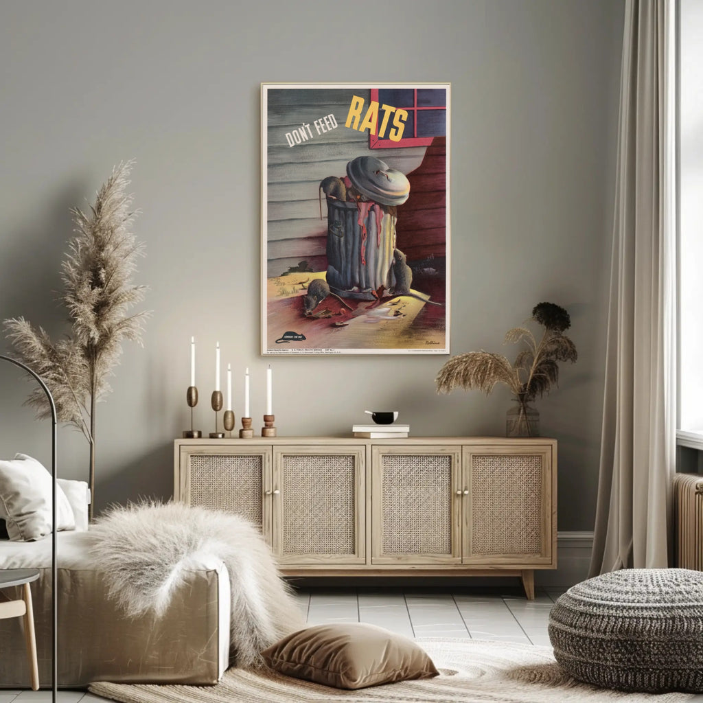 This educational poster highlights the urgent public health message of preventing rat infestations by managing waste responsibly. Set in a residential mid-20th century American neighborhood, the vintage-style design features a scene with rats foraging around an overflowing metallic garbage can. The clear and bold text "DON'T FEED RATS" underscores the cautionary tone. The illustrative style, with its vivid colors and shading, captures the attention while educating viewers about the importance of proper waste disposal. An invaluable addition to collections focusing on historical public service announcements or environmental awareness.