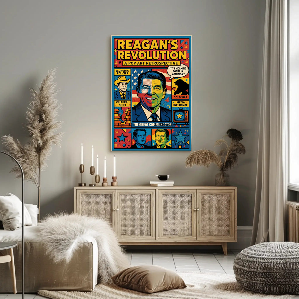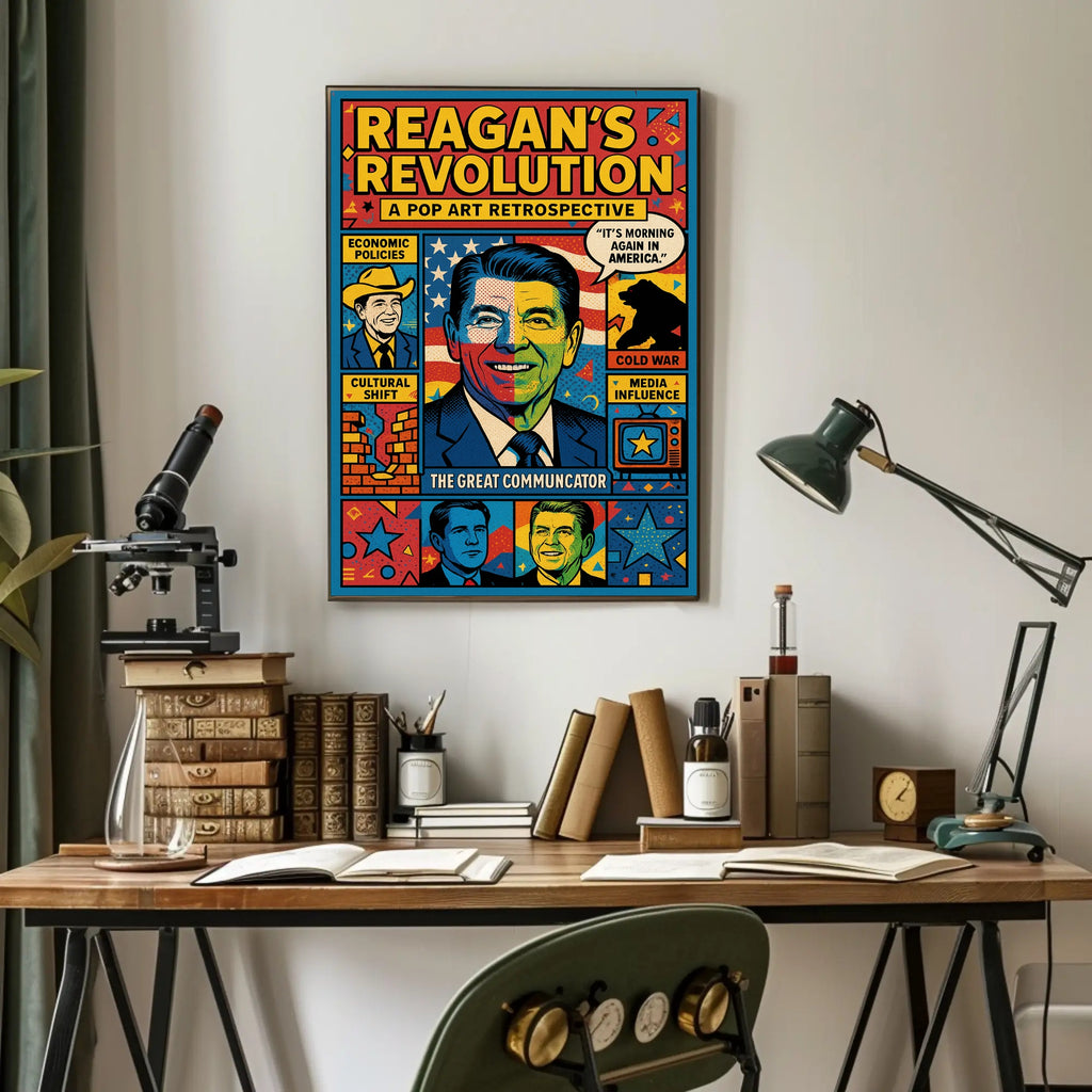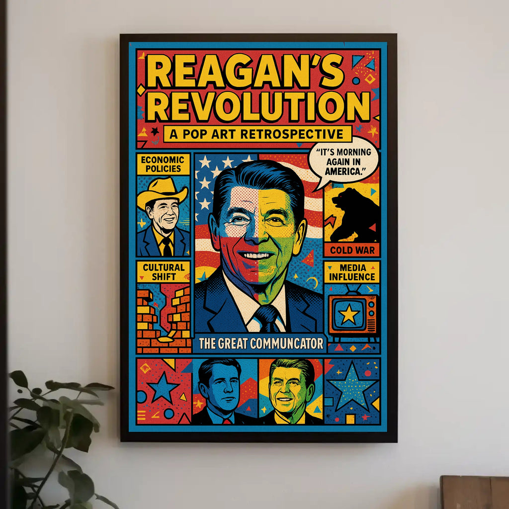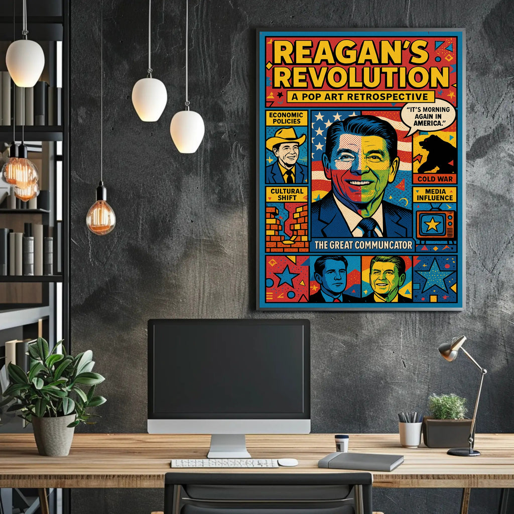 Whether you're decorating a living room, an office gallery wall, or curating a collection of historical pop art, this poster blends cultural commentary with iconic visual style. Add a burst of color and conversation-starting history to your walls — order your REAGAN'S REVOLUTION poster from PosterGoat today and bring 1980s Americana to life.