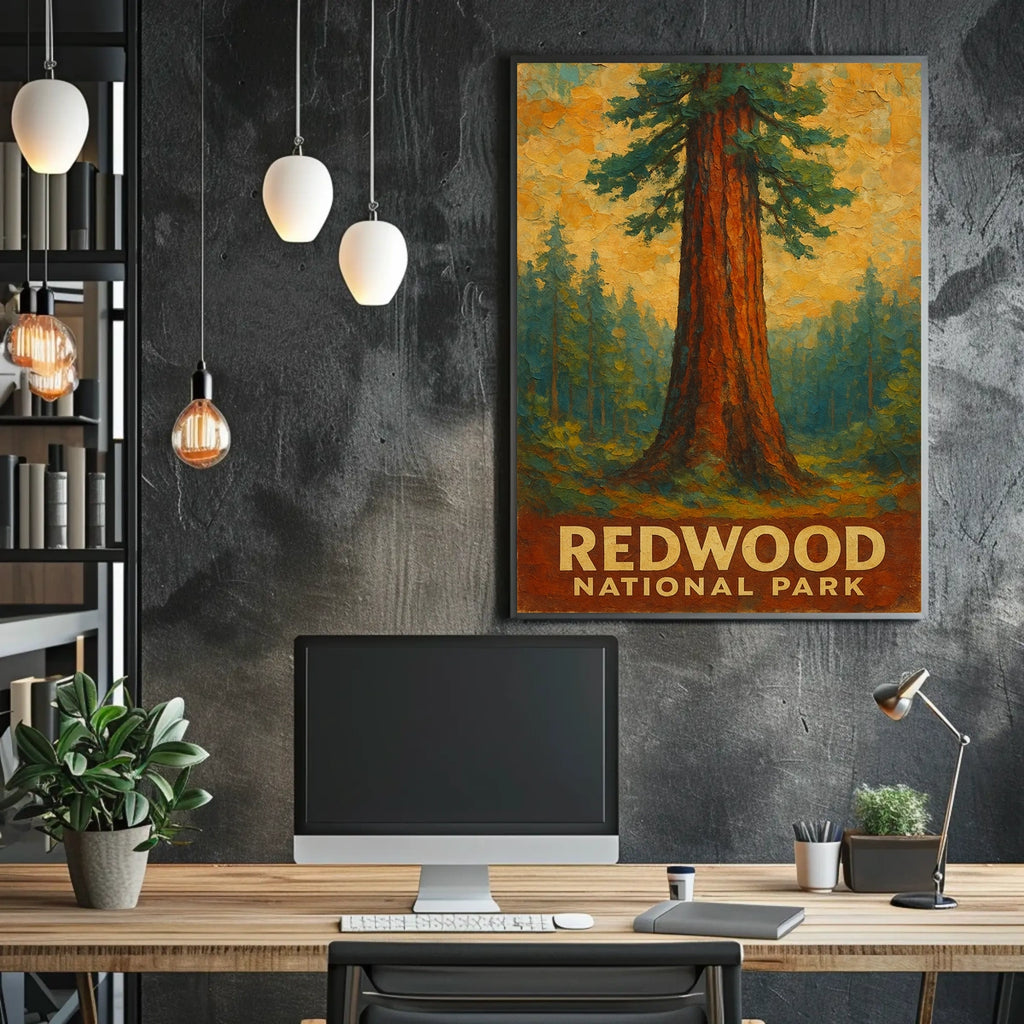 This Redwood National Park poster delivers a visual journey through towering ancient redwoods, mist-kissed canopies, and rugged coastal vistas, making it a standout piece for living rooms, offices, or study areas.