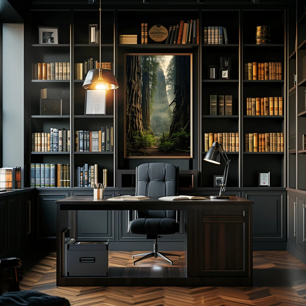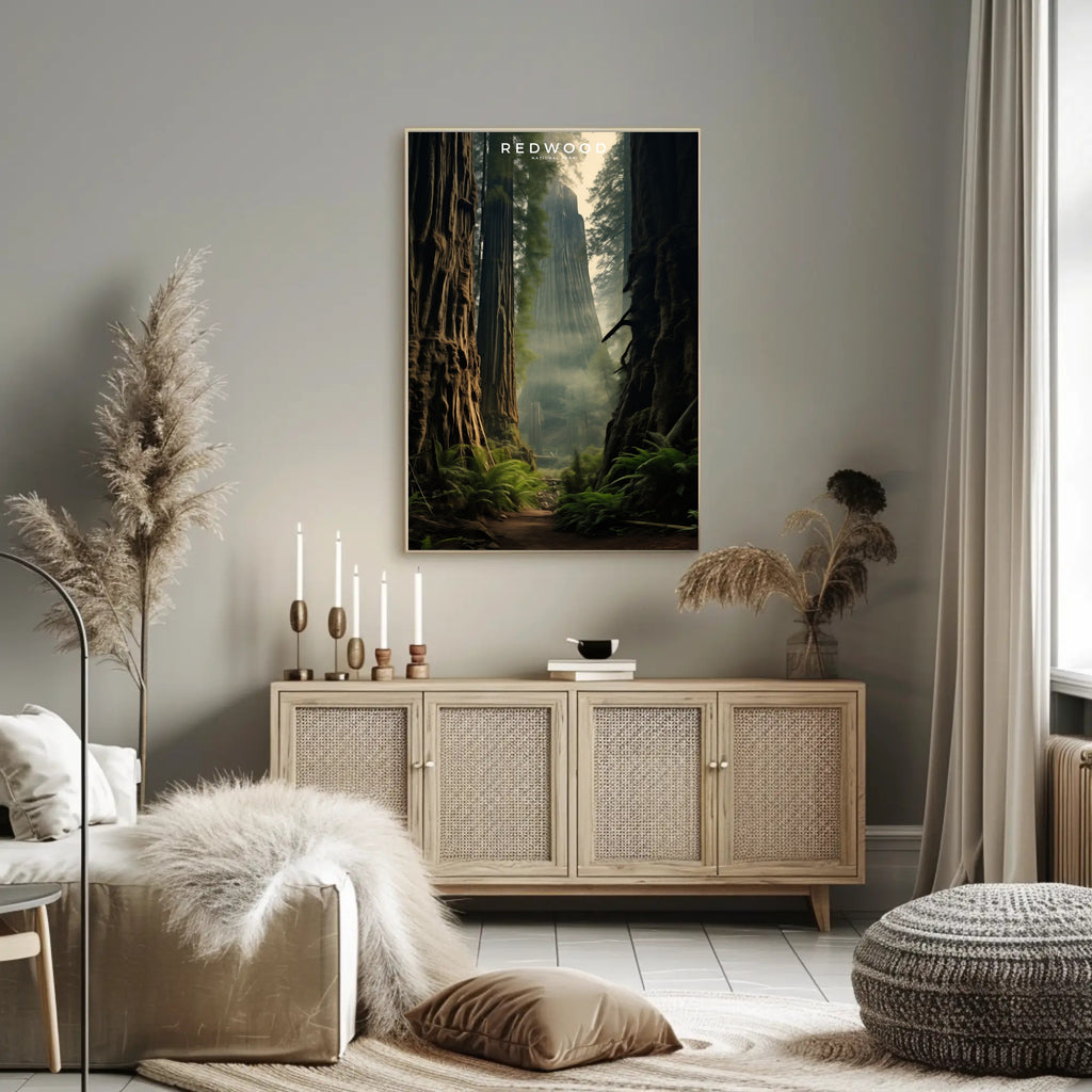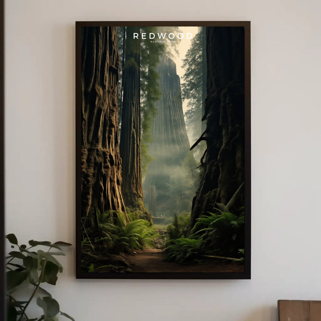 Invite the hush of an ancient forest into your home with the Redwood Tranquility Travel Poster from PosterGoat. This minimalist, travel-style wall art captures towering redwood trunks, a mossy fern-carpeted floor and soft morning mist drifting through a cathedral-like grove — a cinematic landscape print that brings nature’s calm to any room.