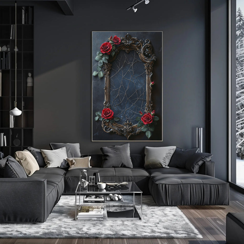 Reflections Of Elegance Poster from PosterGoat transforms any wall into a dramatic focal point. This artful poster features an ornate, antique-style bronze frame set against a deep navy, textured backdrop with a cracked, reflective center — accented by richly detailed red roses and lush green leaves that bring romance and contrast to minimalist interiors.