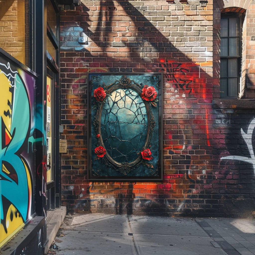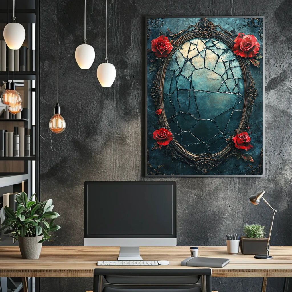 Reflections Of Elegance from PosterGoat is a striking art poster that blends vintage romance with modern minimalism. An ornate oval frame surrounds a cracked, teal-hued mirror surface while vivid red roses punctuate the composition, creating a dramatic focal point that elevates any room in your home or office.