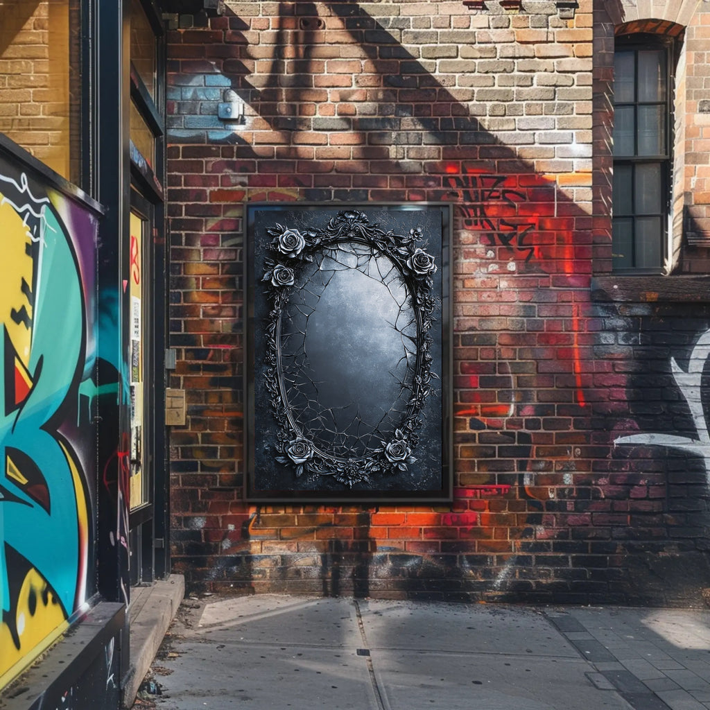 Reflections Of Fragility by PosterGoat is a hauntingly beautiful poster that transforms any wall into a contemplative focal point. Rendered in cool, cinematic tones, this striking art print frames a cracked, antique mirror surrounded by ornate roses and delicate filigree — a perfect blend of minimalist composition and dramatic detail that evokes both elegance and vulnerability.