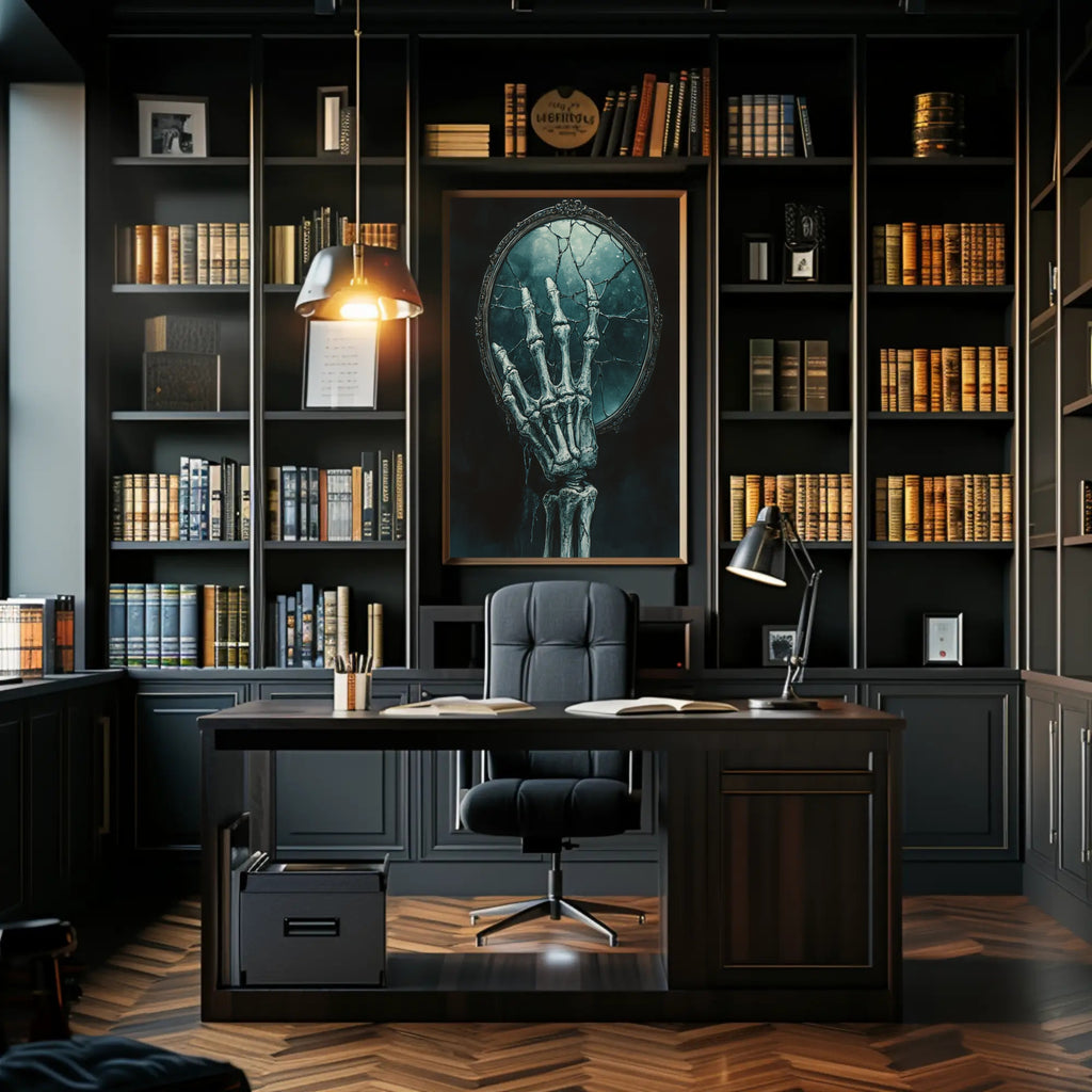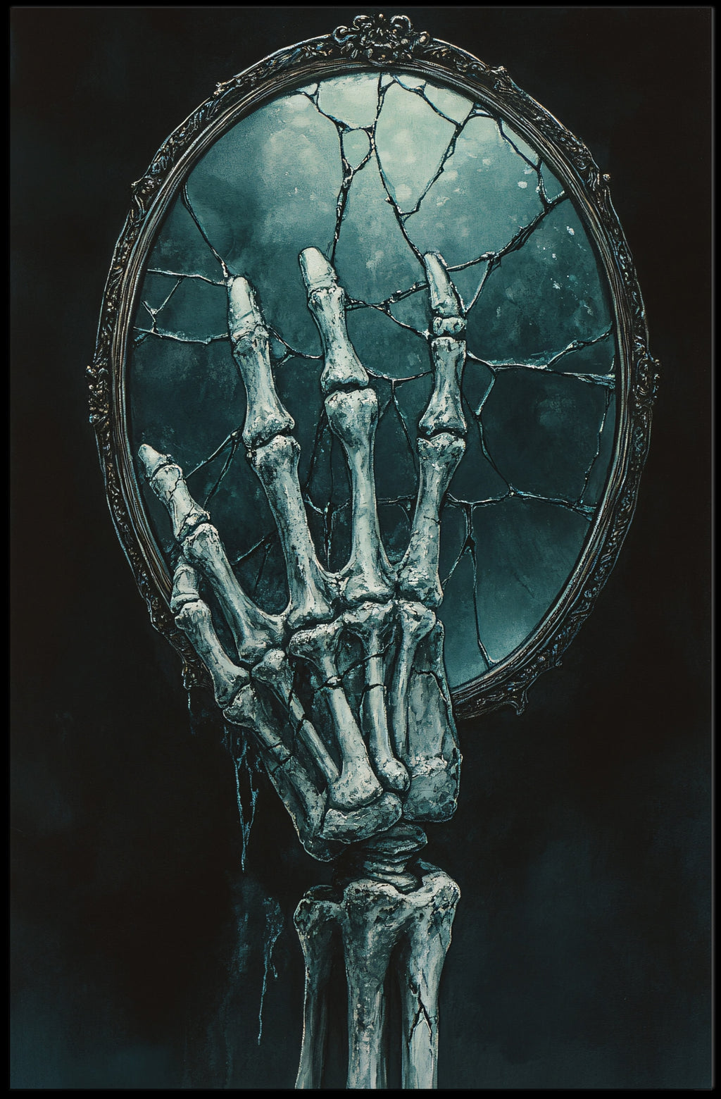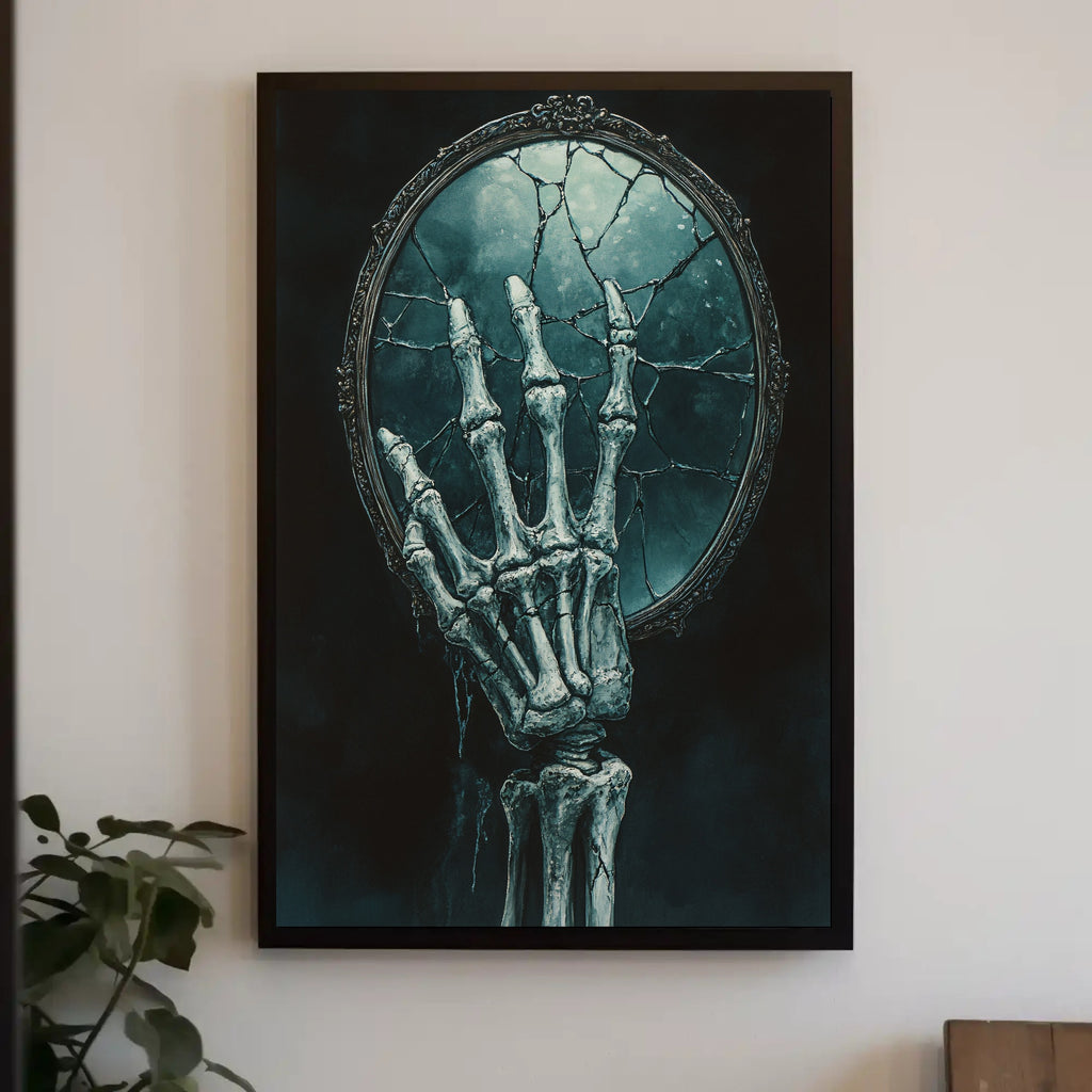 The print depicts a weathered skeletal hand pressing against a cracked antique mirror, rendered in deep teal and midnight tones for a moody, atmospheric effect. Perfect for decor lovers, Halloween collectors, or anyone drawn to contemplative, mortality-themed art, this poster adds dramatic focal interest to living rooms, bedrooms, studios, or gallery walls.