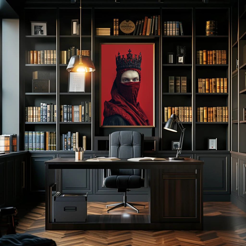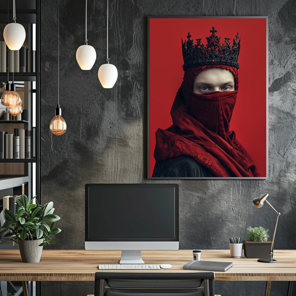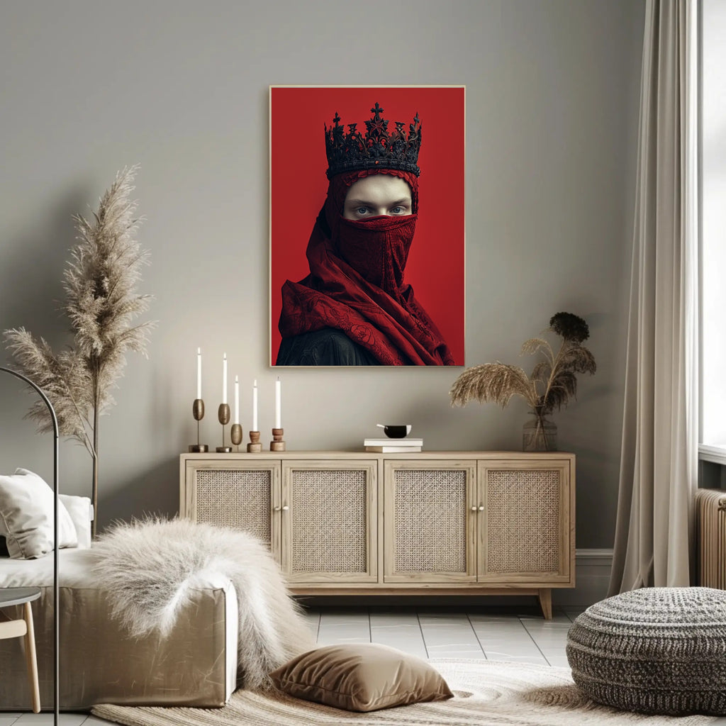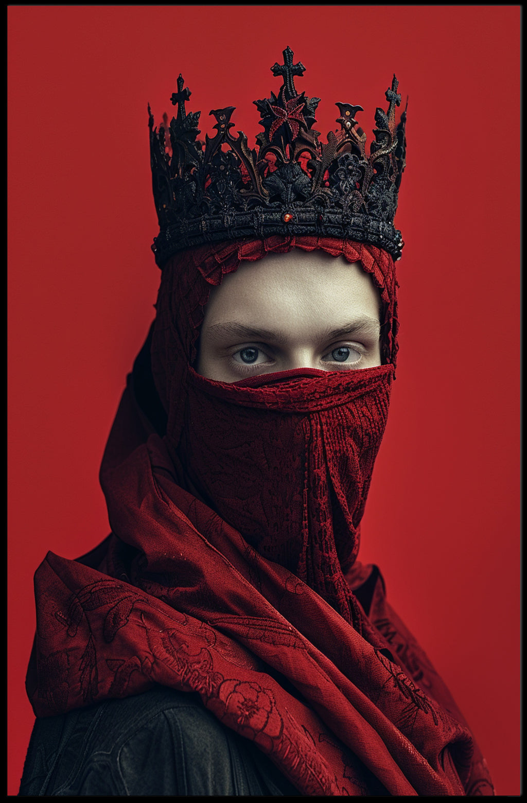 Regal Enigma Art Print Poster from PosterGoat — a striking fusion of regal mystery and minimalist elegance that transforms any wall into a conversation piece. This dramatic portrait features a crowned figure wrapped in richly textured red fabric against a matte crimson backdrop, where only the piercing eyes reveal the soul beneath the veil. Perfect for travelers, art lovers, and anyone drawn to scenic, enigmatic imagery.