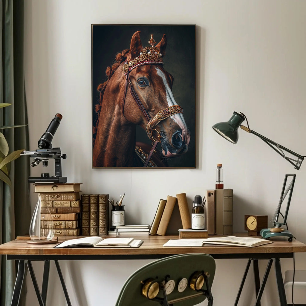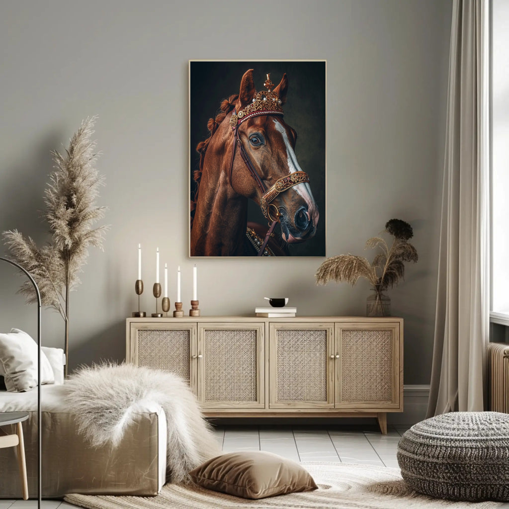 Bring noble elegance to your walls with the Regal Equine Majesty Art Print Poster from PosterGoat. This striking portrait captures a chestnut horse adorned with an ornate jeweled crown and intricately beaded bridle — a dramatic, museum-quality image that elevates any room with timeless equine grace.