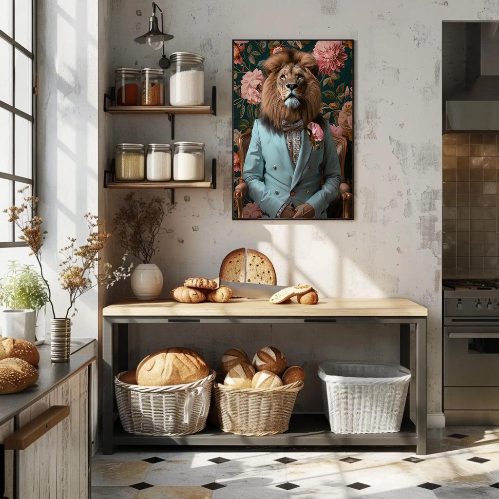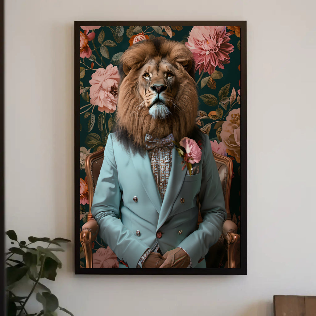 Bring a touch of aristocratic whimsy to your walls with the "Regal Lion Fashion Portrait" poster by PosterGoat. This striking anthropomorphic lion art piece pairs wild majesty with haute couture—featuring a commanding lion with a lush mane dressed in a light blue double-breasted suit, a detailed floral-patterned shirt, a textured bow tie and a delicate boutonniere. The richly patterned floral backdrop and ornate chair frame the portrait, creating a surreal yet sophisticated focal point for any room.