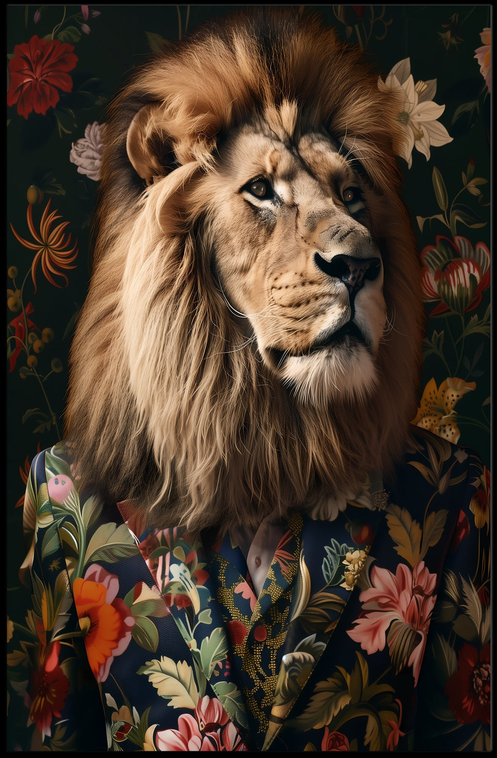 Bring home a striking conversation piece with the Regal Lion in Floral Suit poster by PosterGoat — a photorealistic, surreal work that blends majestic wildlife portraiture with elegant, fashion-forward design. This anthropomorphic lion stares with lifelike detail from a richly textured mane into a background of lush, vintage-inspired florals, creating a dramatic focal point perfect for modern living rooms, offices, or gallery walls.