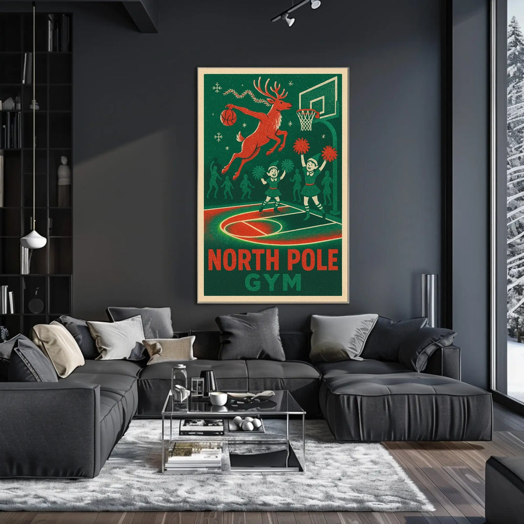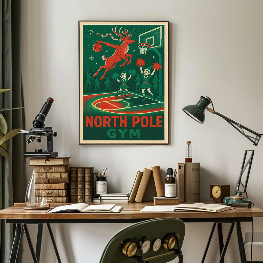 Celebrate the holiday season with the Reindeer Basketball Extravaganza: Playful Sports Poster. This vibrant poster captures the festive spirit of Christmas in a retro design, featuring a reindeer energetically playing basketball at the "North Pole Gym." Surrounded by cheering elves in traditional holiday attire, snowflakes drift through the scene, while bold reds and greens elevate the merry mood. Perfect for sports lovers, holiday enthusiasts, or anyone who wants to bring joy and inspiration into their space.