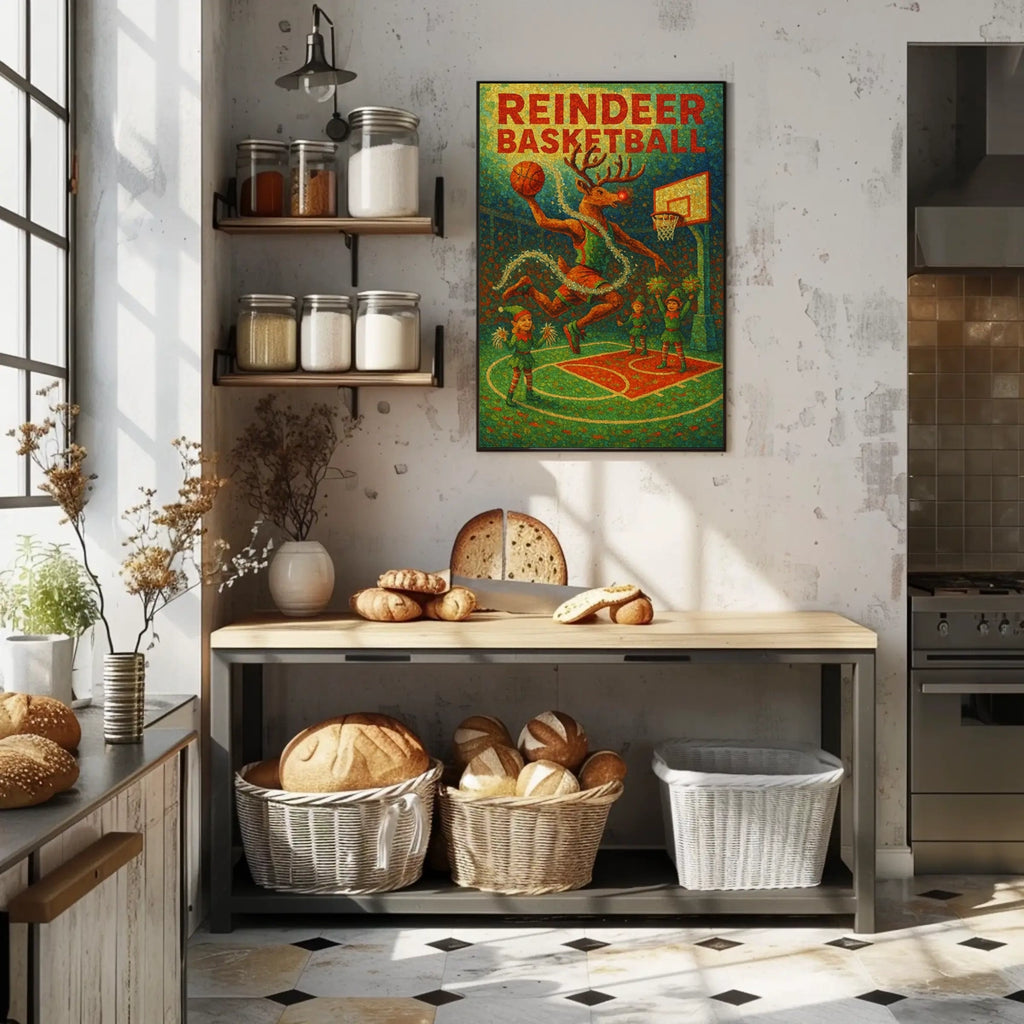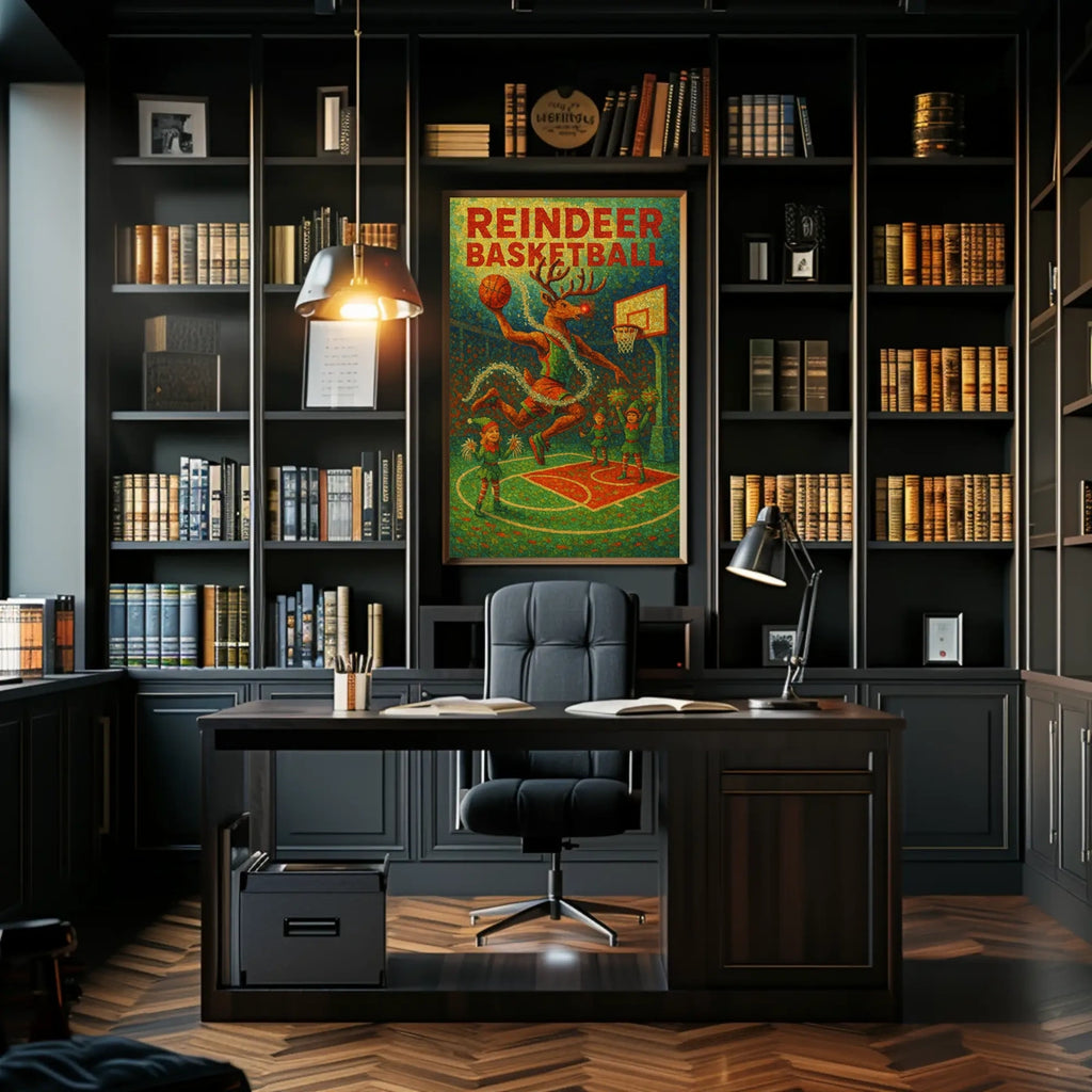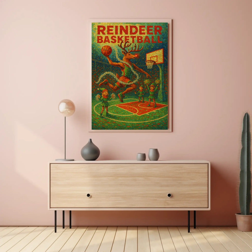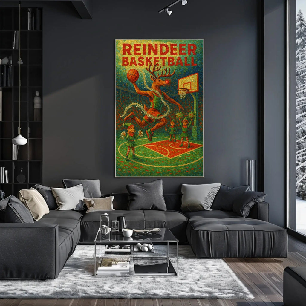 The poster captivates with scenic visuals inspired by real-world scenery, blending reindeer imagery with basketball motifs in a playful yet stylish way that complements any decor.