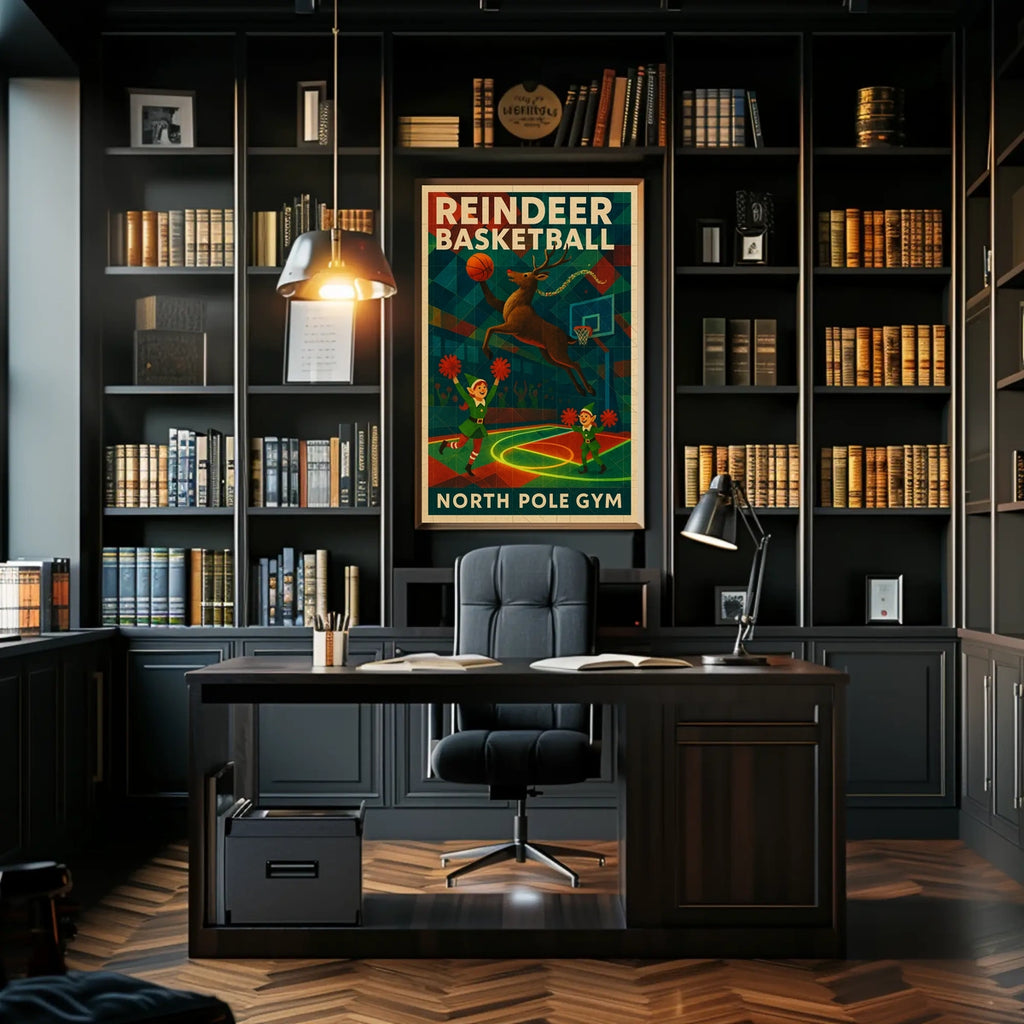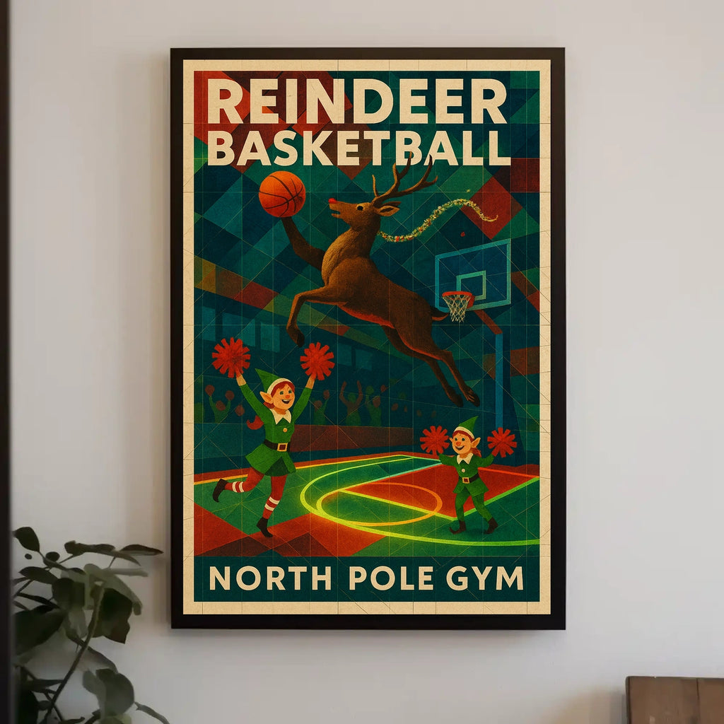 This art print blends festive reindeer imagery with dynamic basketball energy, drawing inspiration from real-world scenic vistas. A versatile addition for living rooms, bedrooms, or offices, it elevates decor with a touch of whimsy and sport.