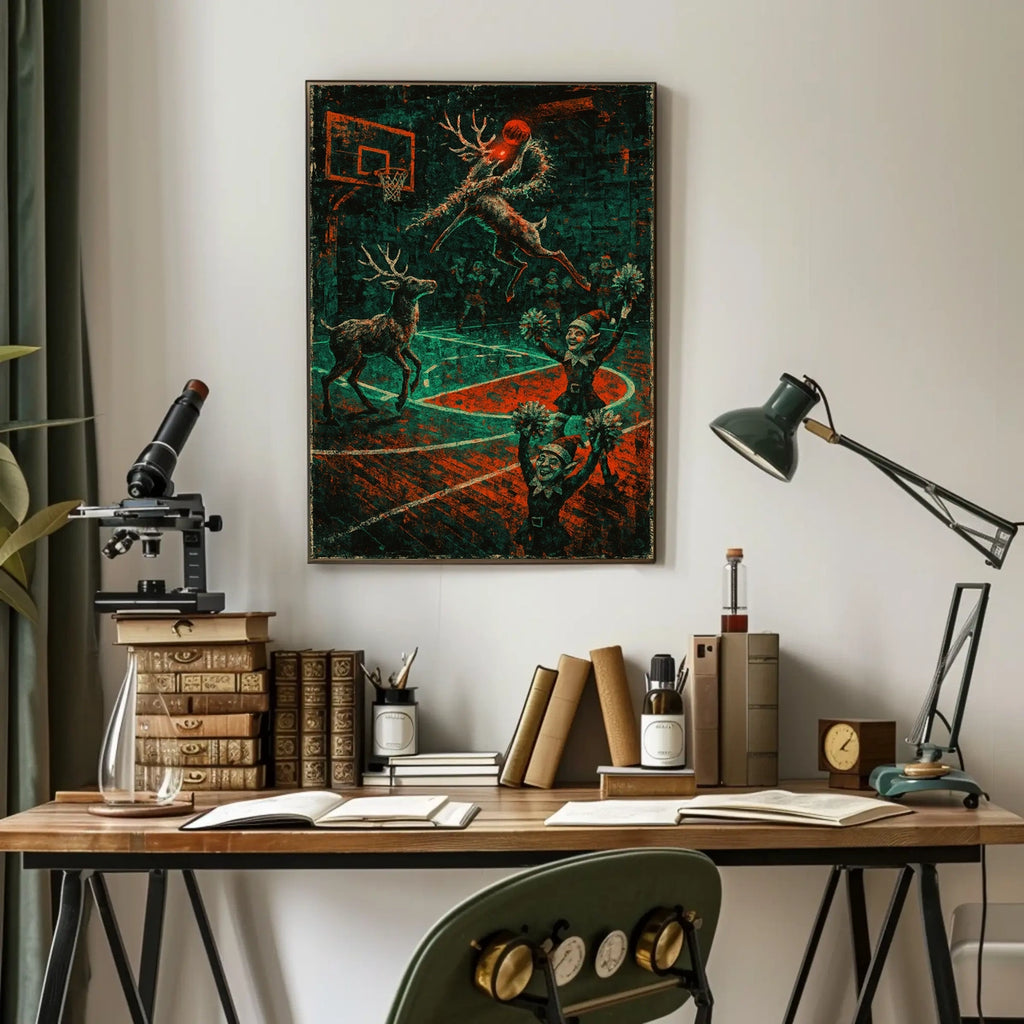 - Detailed design highlighting the fusion of wildlife and sport, capturing a dynamic reindeer basketball showdown