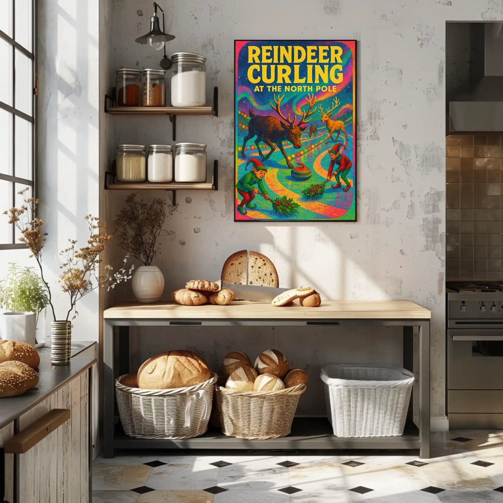 Conversation piece that connects art, travel, and imagination — bring Reindeer Curling at the North Pole Poster into your home, classroom, or office today