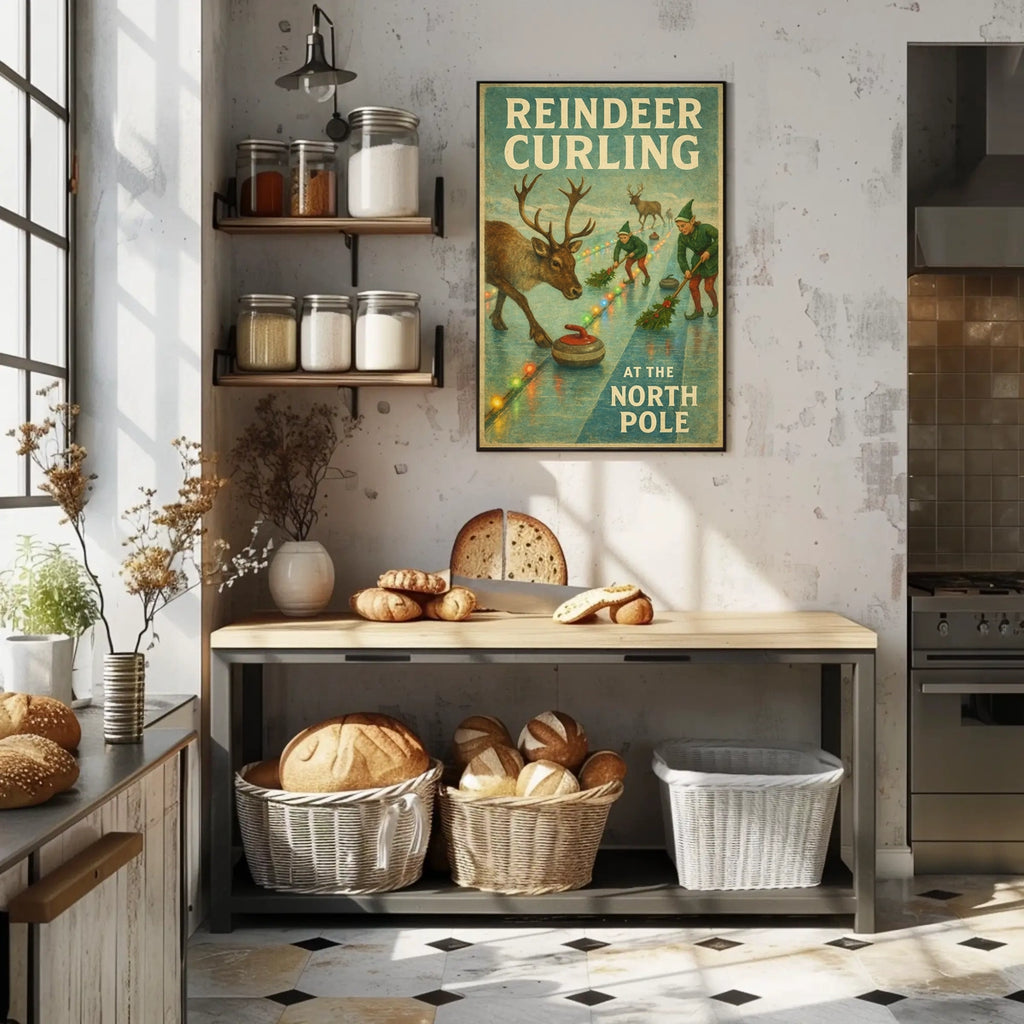 Reindeer Curling at the North Pole Poster celebrates the beauty of this whimsical scene. Designed for decor lovers and wanderlust spirits, this art print adds charm to any room with visuals inspired by real-world scenery.