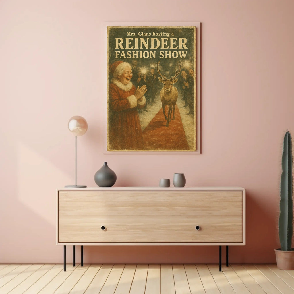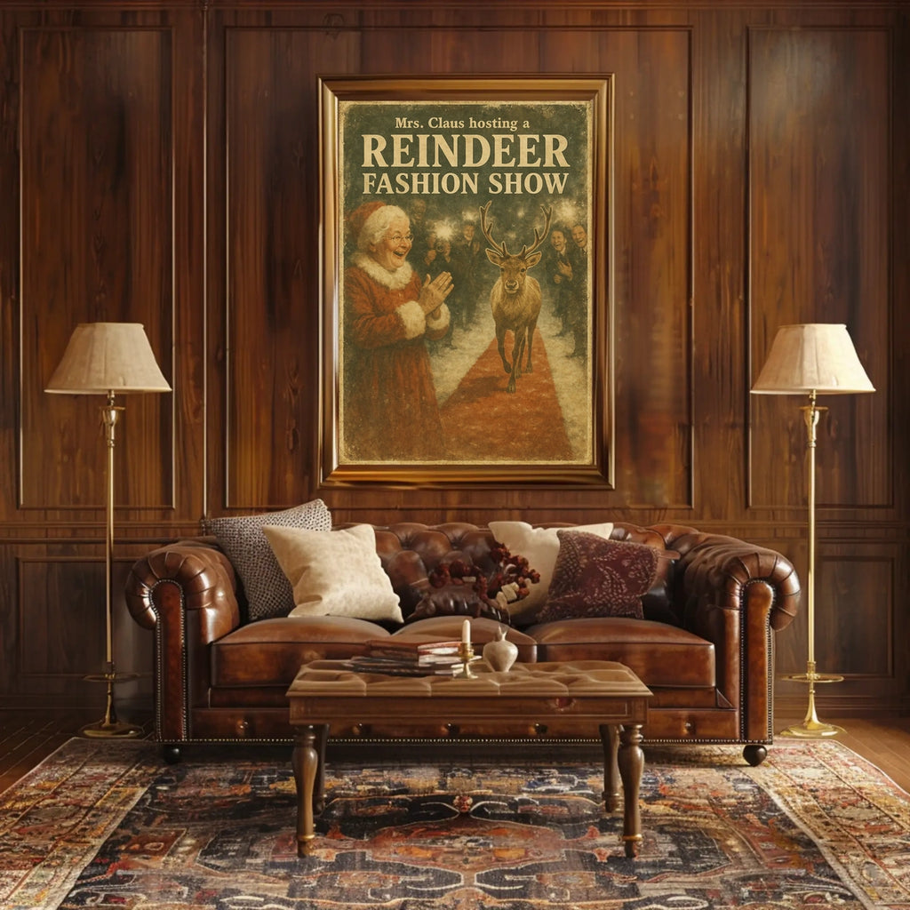 Celebrate the whimsy of the Reindeer Fashion Extravaganza Vintage Christmas Poster, a timeless wall art piece that captures the playful charm of the holiday season. This delightful scene, hosted by Mrs. Claus, features a reindeer strutting down a red carpet while onlookers snap memorable photos. With muted, warm tones and an aged-paper texture, this vintage-style artwork evokes nostalgia and holiday cheer—an ideal addition for Christmas lovers and vintage-art enthusiasts alike.