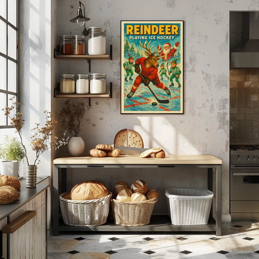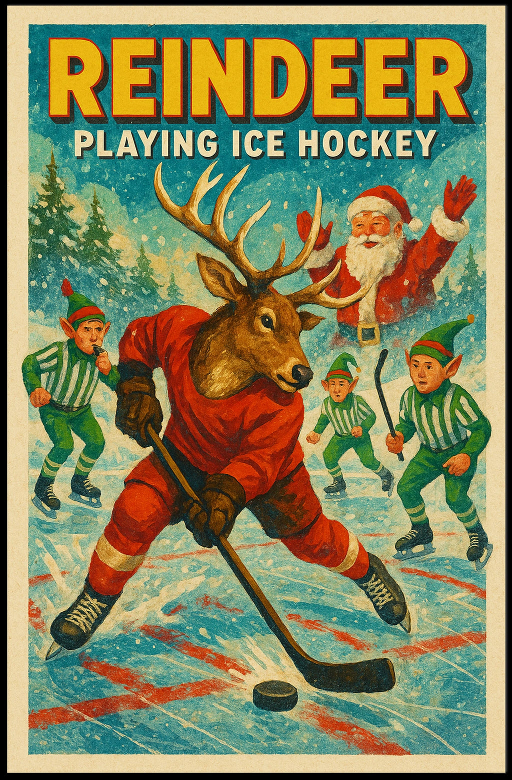 This enchanting poster captures a whimsical and playful scene featuring a reindeer in a red ice hockey uniform, skating energetically on a frozen pond. Set against a snowy, magical backdrop, the vintage-style illustration presents Santa Claus and a group of elves cheering and participating in the game. The bold colors and cartoonish design evoke a nostalgic mid-century holiday ambiance, making it an ideal festive decoration.