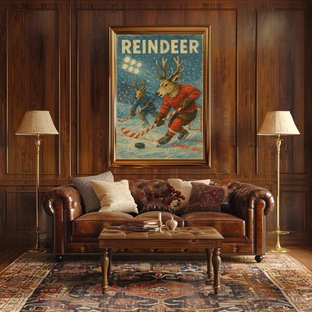 Step into a whimsical winter wonderland where playful reindeer take center stage in an imaginative ice hockey match. These charming characters, clad in vibrant red and cool blue uniforms, glide across an icy rink wielding candy cane-patterned hockey sticks. The scene is set against a serene snowy backdrop, illuminated by glowing floodlights that hint at a joyous holiday game. The poster's vintage-style, painterly design evokes nostalgia, blending icy blues with warm reds to capture the festive spirit. It's a delightful fusion of sports and seasonal cheer, perfect for adding humor, warmth, and joyful holiday decor to any space.