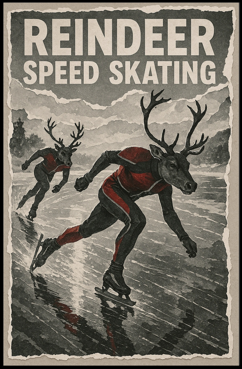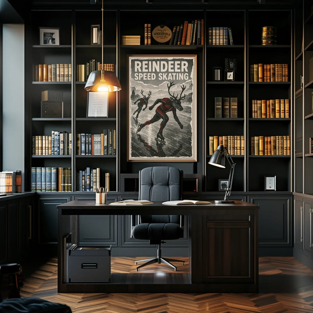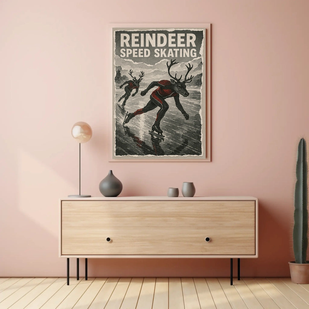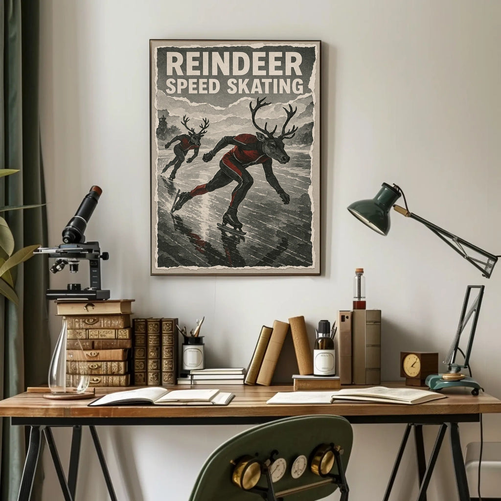Dive into a whimsical world with this surreal depiction of humanoid reindeer speed skating on an icy track. Dressed in sleek red and black suits, these fantastical creatures blend athleticism with a humorous twist. Their antlers and reindeer heads add a playful touch to a vintage-inspired illustration, characterized by a textured retro print quality. The muted gray palette with hints of red and a wintery backdrop enhances the nostalgic and playful mood. Perfect for those who appreciate fantasy sports themes and humorous art, this poster is a delightful addition to any collection.