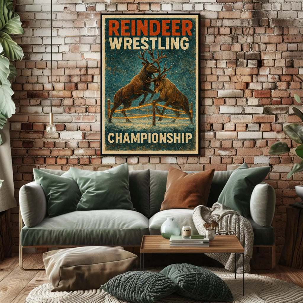 This eye-catching poster merges winter wonderland charm with classic sports nostalgia. Two spirited reindeer grapple in a playful bout while ropes glow like festive lights. The snow-dusted backdrop and vintage-inspired illustration add a touch of whimsy to any wall, making it a delightful centerpiece for seasonal displays or year-round decor.
