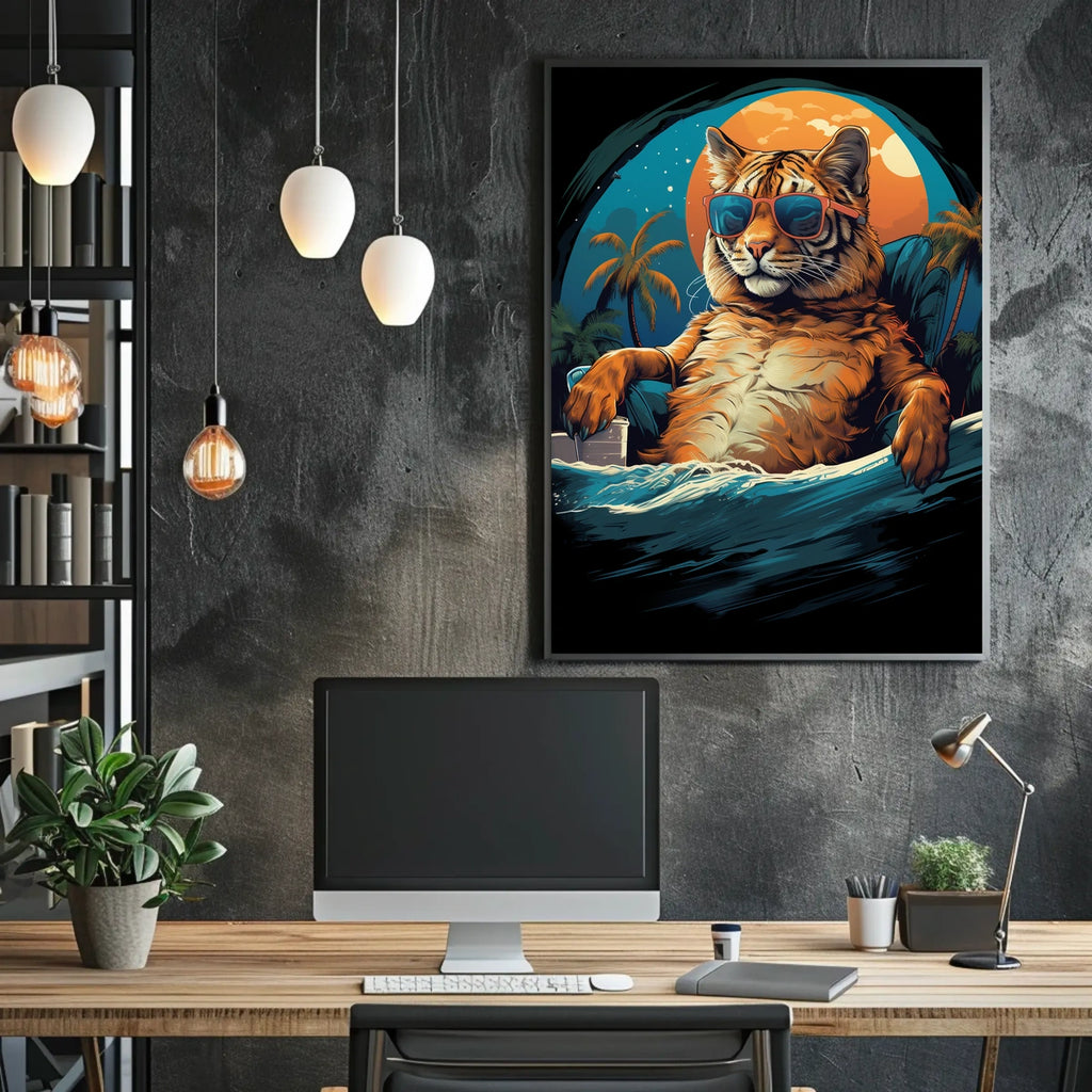 Dive into tropical relaxation with the Relaxed Tiger on Beach Artistic Animal Poster — a timeless wall art piece that fuses wildlife charm with sunny beach vibes. The image of a laid-back tiger in sunglasses lounging under palm trees illustrates a carefree island escape, brought to life by vibrant warm hues and the glowing orange of a setting sun. Perfect for adding a playful yet calming touch to your space, this poster speaks to those who love a combination of humor and excellent design. Immerse yourself in the allure of island paradise as you let this lively creature elevate your decor.
