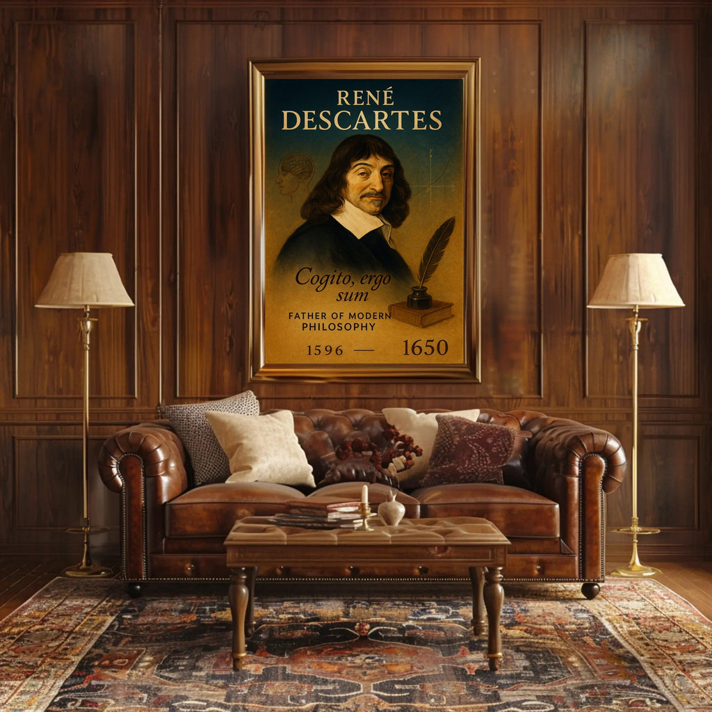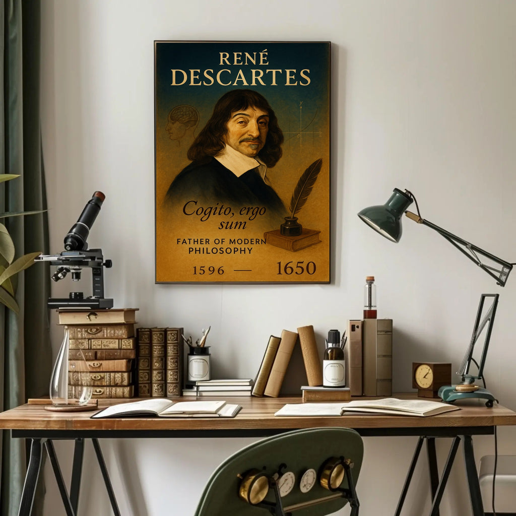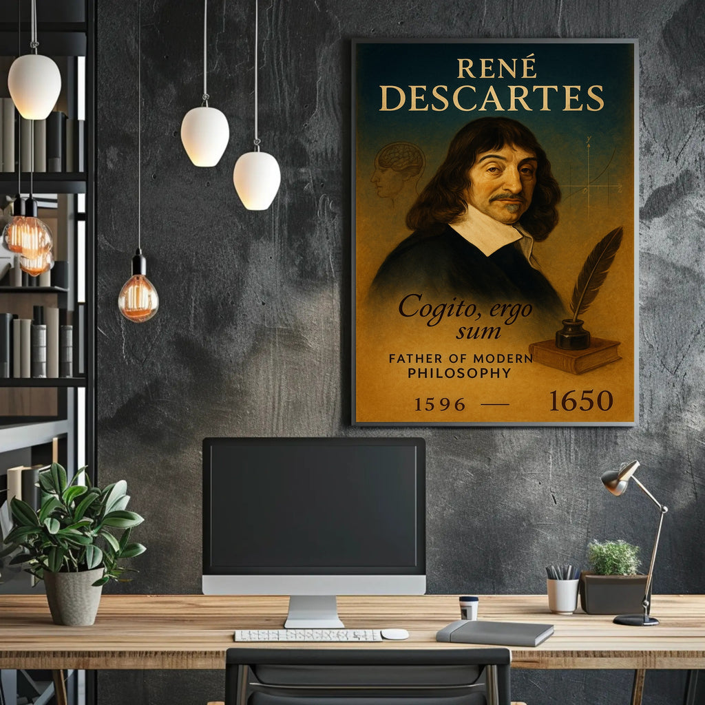 Elevate your home or study with the René Descartes Modern Philosophy Poster by PosterGoat — a refined, minimalist print that celebrates the father of modern philosophy in warm, vintage tones. This elegant wall art pairs classical portraiture with subtle intellectual motifs: a faint brain sketch, a Cartesian coordinate curve, a quill and inkwell resting on a book, and the timeless motto Cogito, ergo sum—all arranged for visual balance and quiet sophistication.