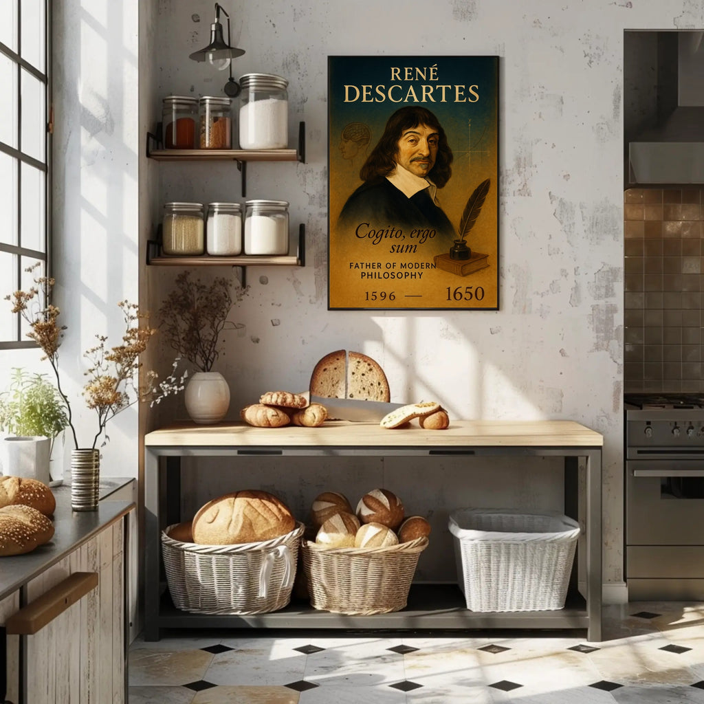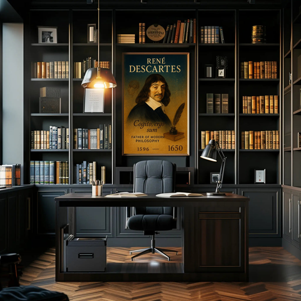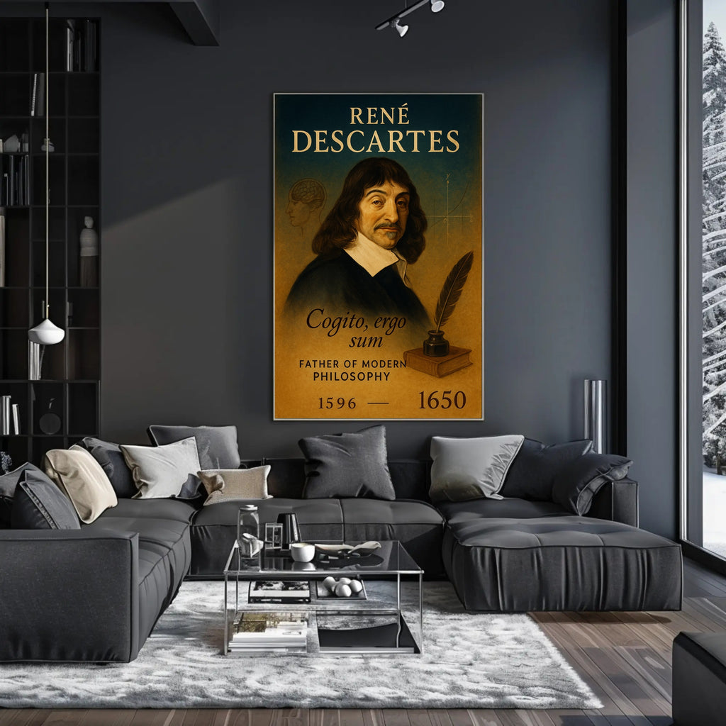 Elevate your home or study with the René Descartes Modern Philosophy Poster by PosterGoat — a refined, minimalist print that celebrates the father of modern philosophy in warm, vintage tones. This elegant wall art pairs classical portraiture with subtle intellectual motifs: a faint brain sketch, a Cartesian coordinate curve, a quill and inkwell resting on a book, and the timeless motto Cogito, ergo sum—all arranged for visual balance and quiet sophistication.