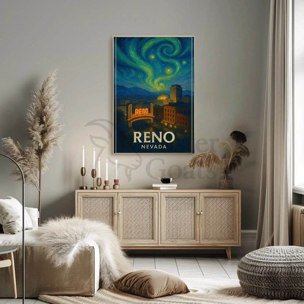 Elevate your space with this beautiful Reno Nightlife Inspired Artistic Travel Poster and let its captivating imagery spark joy and conversation. Order yours today and transform any room into a celebration of art and culture!