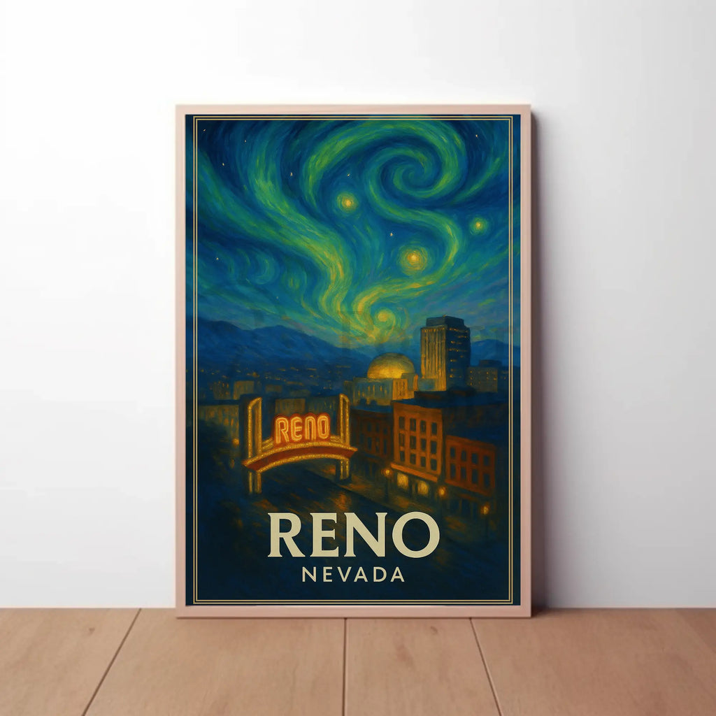 Immerse yourself in the enchanting essence of Reno with our Reno Nightlife Inspired Artistic Travel Poster. This stunning piece captures the vibrant energy of the city through an artistic lens reminiscent of Vincent van Gogh's renowned style. The artwork features a captivating night scene, brimming with swirling colors and dynamic brushwork that evoke a sense of wonder and excitement.