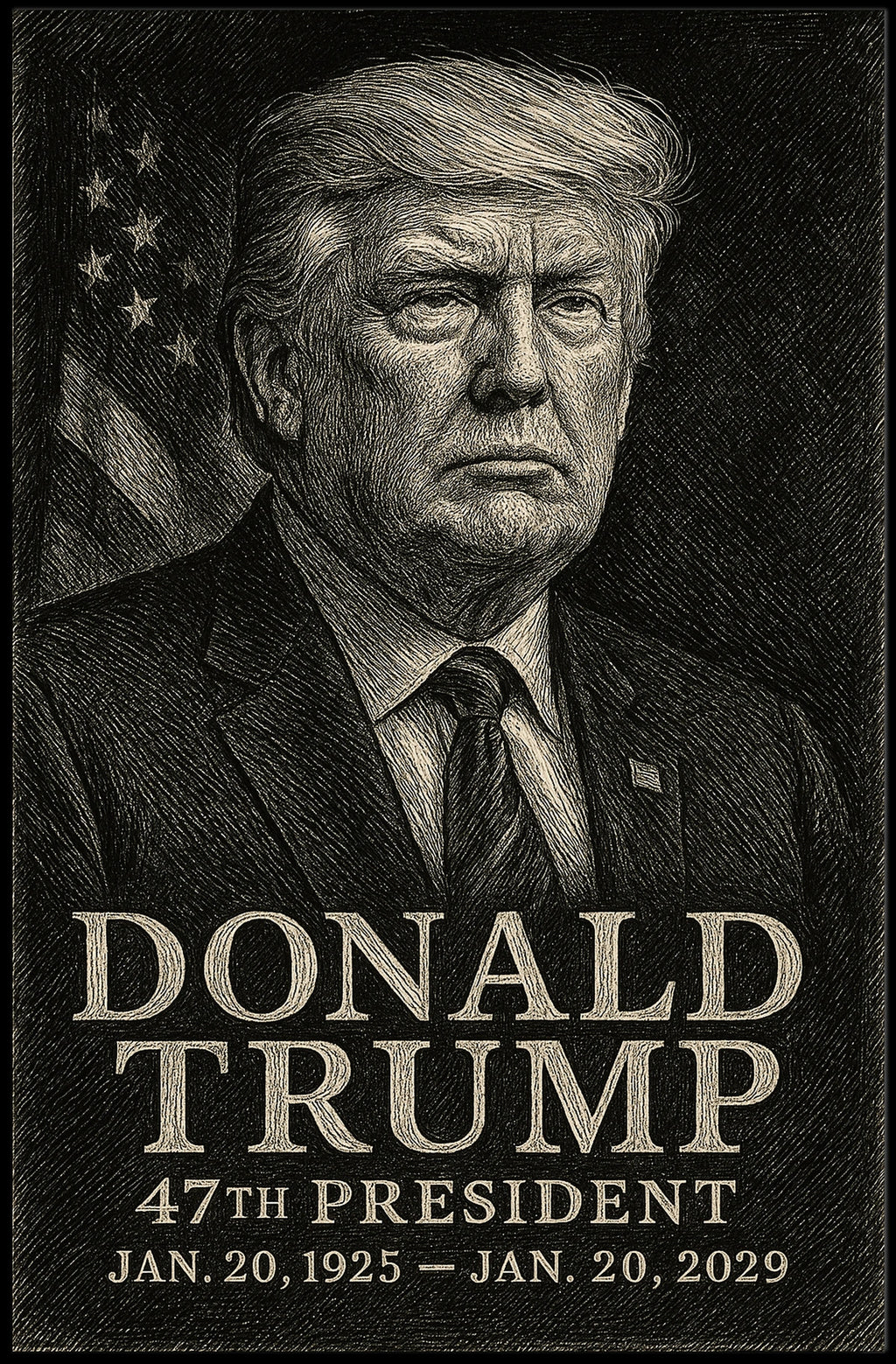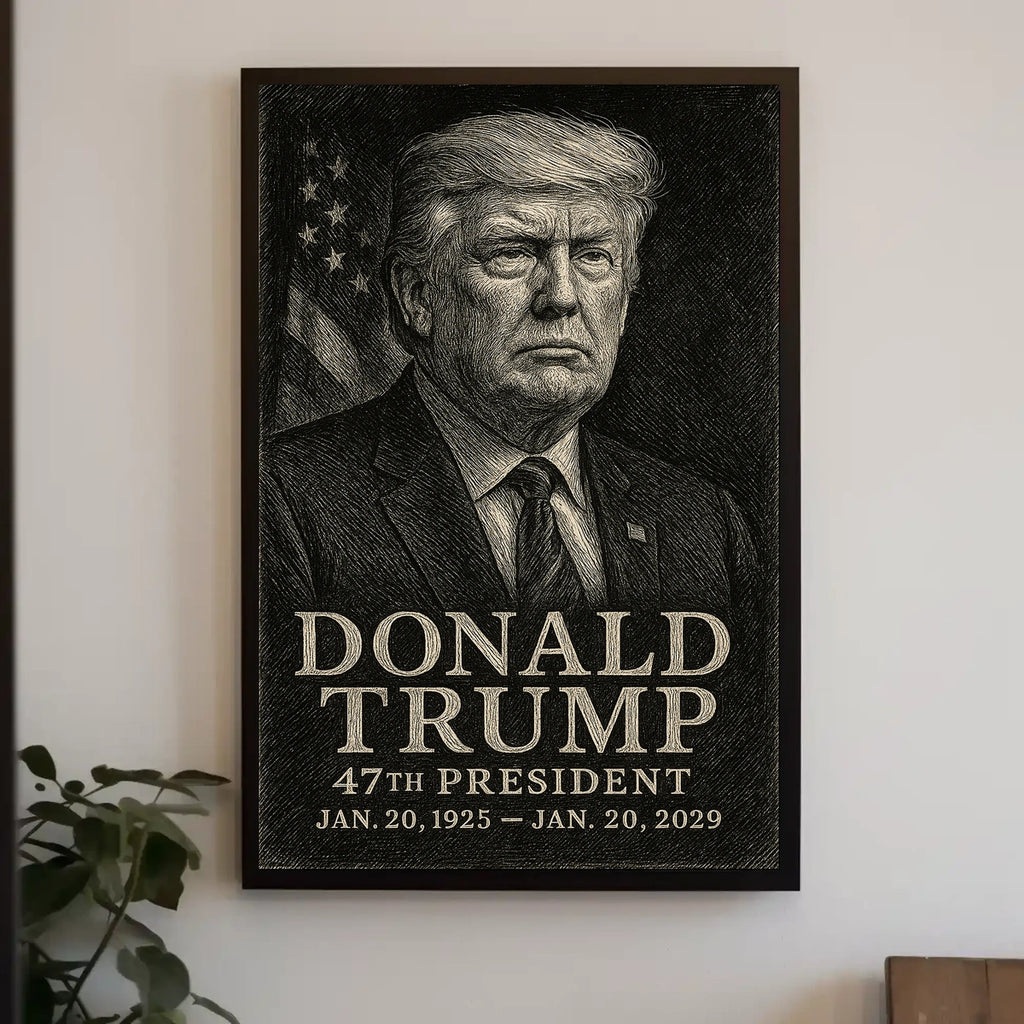 This wall art depicts President Donald Trump in a moment of profound reflection, captured in an exquisite etching style. The crosshatching technique lends depth and texture, while the patriotic backdrop of the American flag reinforces a sense of leadership and national pride. A timeless tribute to presidential leadership, it projects authority and steadfast resolve that transcends the era.