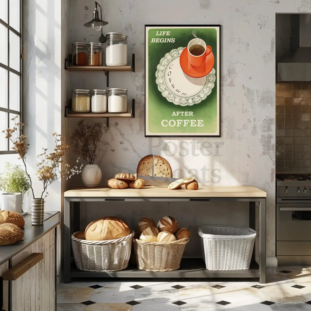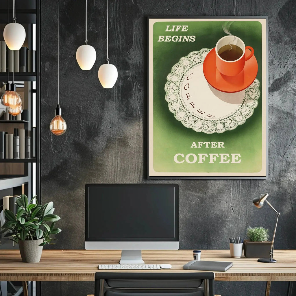 This artful poster features a warm, mid-century inspired composition: a steaming orange cup and saucer set atop a delicate lace doily, set against a rich green gradient background. Bold retro typography reads “LIFE BEGINS AFTER COFFEE,” giving the piece a playful, nostalgic personality that instantly brightens any wall.