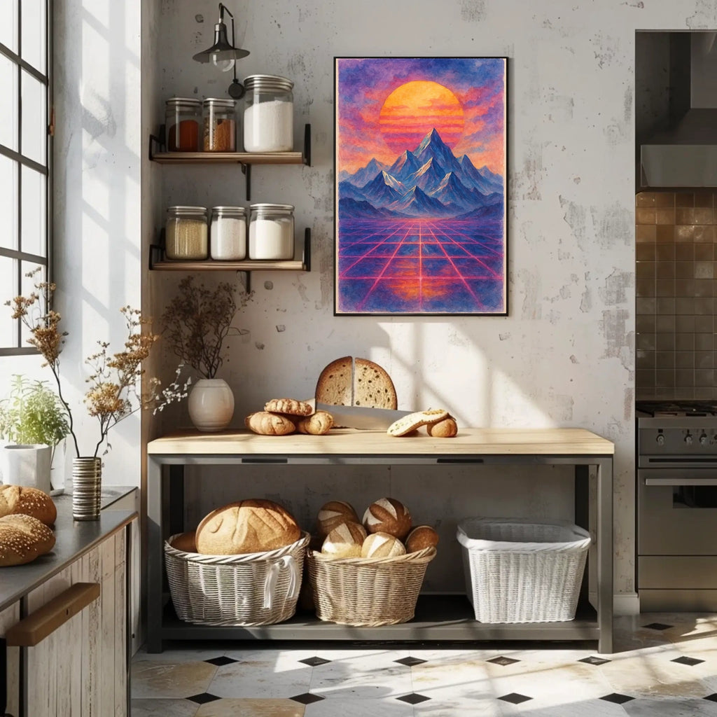 Central to the piece are majestic mountains in shades of blue and indigo, contrasted by a vivid setting sun adorned with a striped texture of orange and pink tones. A grid pattern in the foreground evokes the 1980s sci-fi and synthwave aesthetic, creating a striking blend of digital nostalgia and adventure. The atmospheric purple and pink sky adds a dreamy, otherworldly ambiance, making it a bold addition to any space.