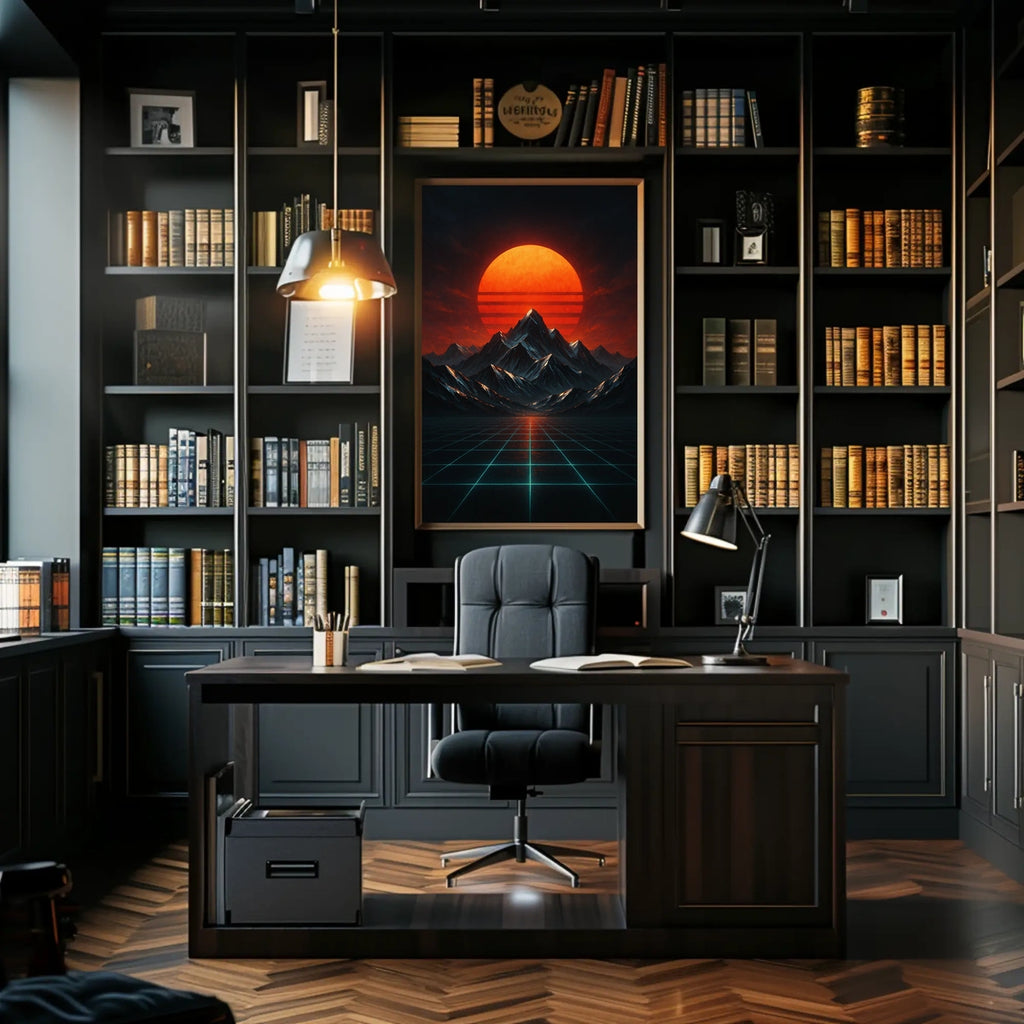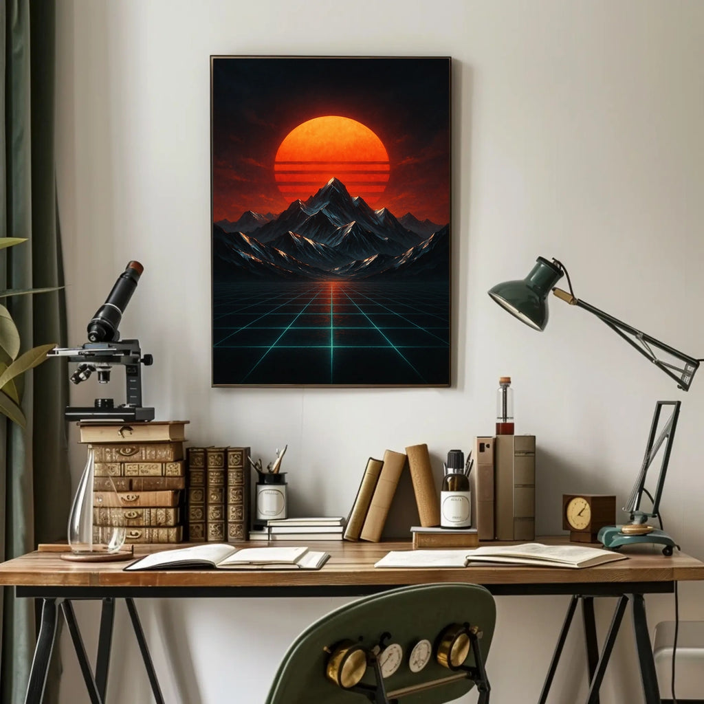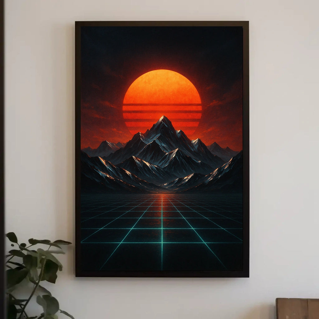 Retro-futuristic Landscape with Neon Glow Futuristic Sci-Fi Poster celebrates the beauty of this artwork. Experience the surreal beauty of a retro-futuristic landscape where a massive red sun either rises or sets behind a series of dark, jagged mountains. This stunning poster captures the essence of 1980s synthwave, merging it with modern digital art to create a dramatic and otherworldly scene. A glowing grid of neon blue lines extends infinitely, adding depth and a technological ambiance. The vivid colors and nostalgic style evoke themes of exploration and futuristic vistas, making it a perfect addition to any contemporary art collection or sci-fi enthusiast's space.