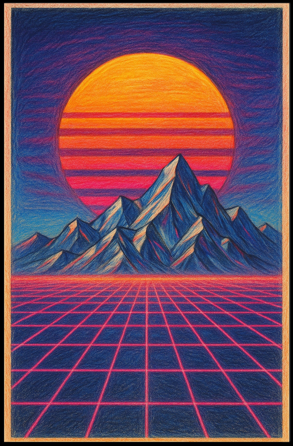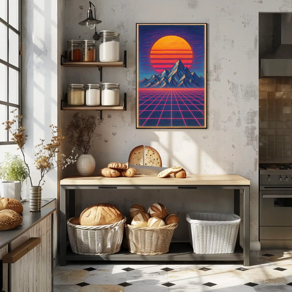 Celebrate the beauty of Retro-Futuristic Neon Landscape Poster — Futuristic Sci-Fi Poster with this timeless wall art. Designed to capture its unique appeal, this piece is perfect for collectors, enthusiasts, or anyone who wants to bring meaning and inspiration into their space. This 80s-inspired retro-futuristic world features a stylized grid-like foreground that leads to sharp, angular mountains beneath a vividly colored sun. The sky transitions from deep blues to vibrant oranges and pinks, creating a striking contrast with the cool, digital-like landscape. Embrace the synthwave aesthetic with bold neon hues and geometric patterns that evoke futuristic nostalgia.