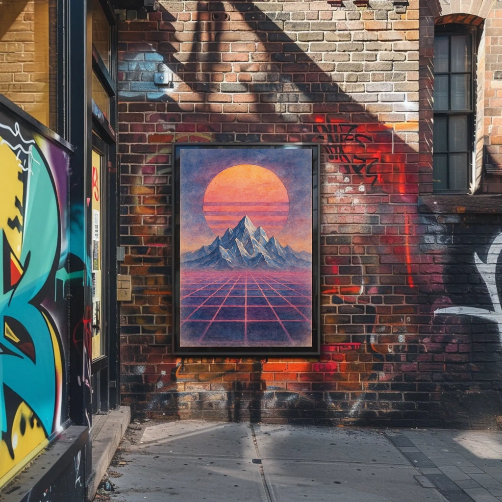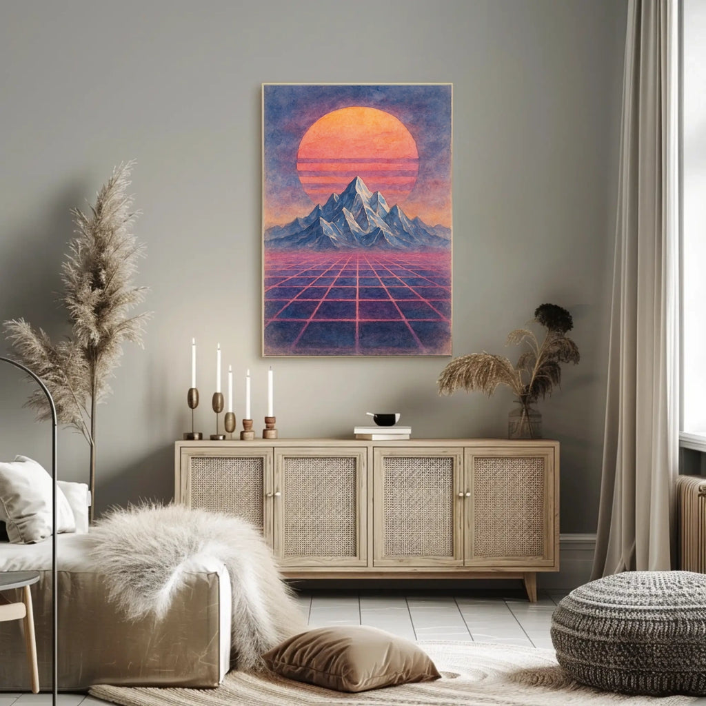 Immerse yourself in a thrilling retro-futuristic scene: a luminous sun sets behind snow-dusted mountains, while a foreground grid evokes classic 1980s computer graphics. The bold synthwave palette of pinks, purples, and oranges blends nostalgia with forward-looking vision, creating a surreal, digital-meets-natural landscape that invites exploration and imagination.