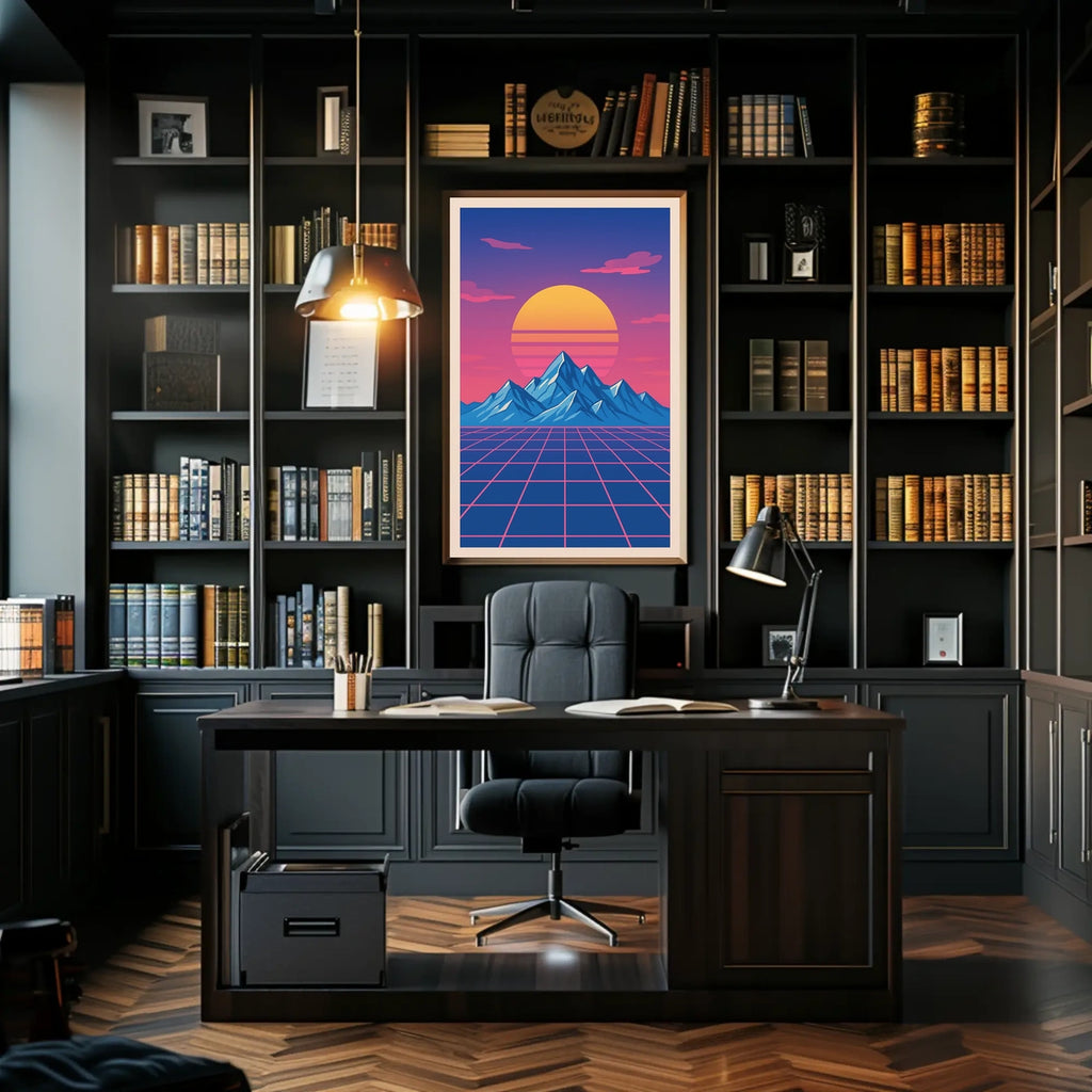 Retro-Futuristic Sunset Art Print: Futuristic Sci-Fi Poster invites you to immerse yourself in a vibrant, retro-futuristic dreamscape. The composition centers a stylized mountain range beneath a surreal sunset, as the sky transitions from deep blue to pink with stylized clouds that heighten the ethereal atmosphere. Dominating the scene is a large, yellow-orange sun with horizontal lines, exuding an authentic retro vibe. In the foreground, a grid-like plane nods to classic 80s digital aesthetics, blending synthwave and vaporwave styles. With bold colors and clean geometric lines, this imaginative piece is a nostalgic celebration of futuristic digital art.