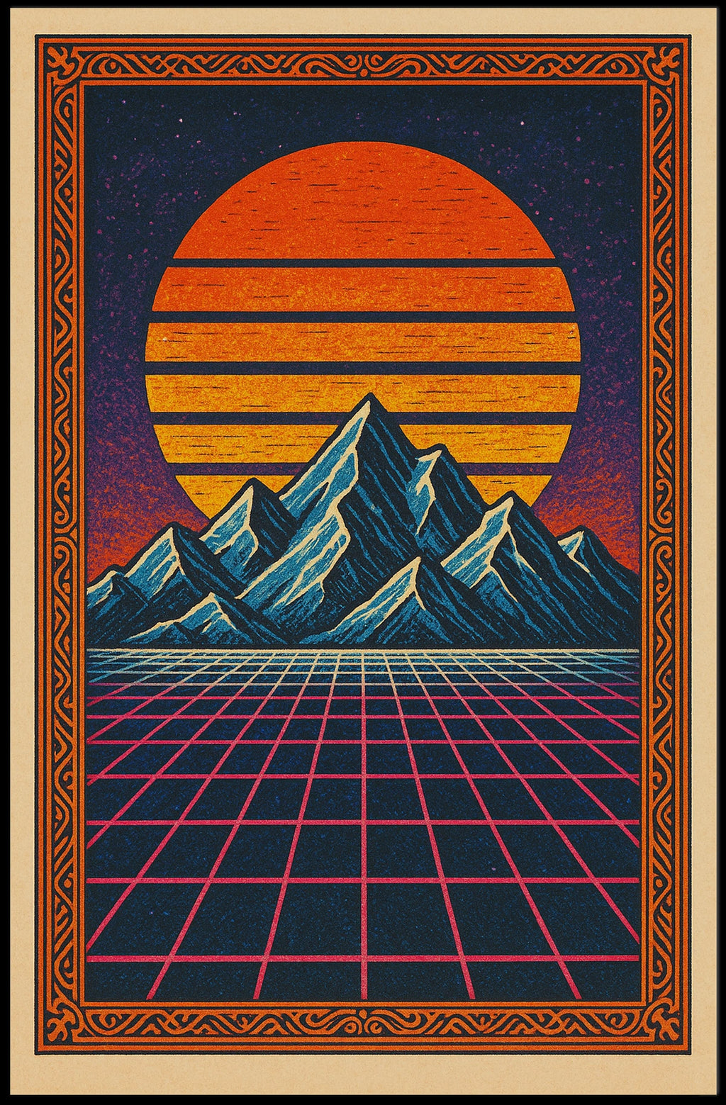 Dive into a world where the past meets the future with this retro-futuristic surreal landscape poster. Featuring blue-toned mountain peaks that center the composition, the piece is set against a striking backdrop of a large, striped sun in vivid orange and yellow hues. The neon pink, grid-like floor evokes a sense of digital nostalgia, channeling the essence of a virtual reality setting from the 1980s. Intricate ornamental patterns frame the scene, adding a vintage touch. This bold and vibrant artwork seamlessly blends nostalgic and sci-fi themes, making it a standout piece for any modern art lover.