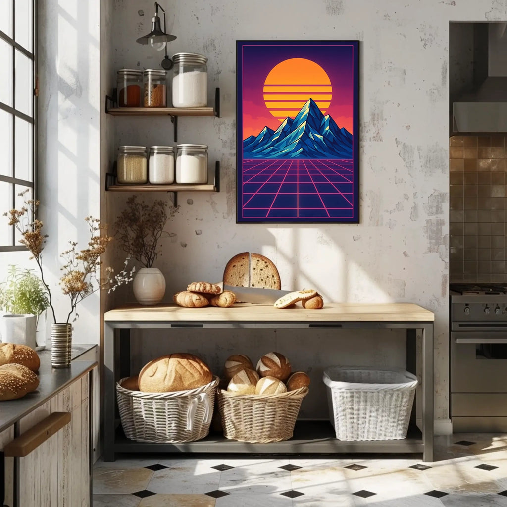This poster captures retro-futurism with a vivid synthwave aesthetic. The design showcases a vibrant neon color palette, featuring stylized blue mountains beneath an oversized orange sun adorned with horizontal stripes. This striking visual is set against a background of warm purples and pinks, evoking the nostalgic allure of the 80s. A grid-like structure in the foreground adds a digital, virtual dimension to the piece. Perfect for lovers of retro, vaporwave, and digital art, this poster brings a surreal blend of vintage and sci-fi elements to any space.