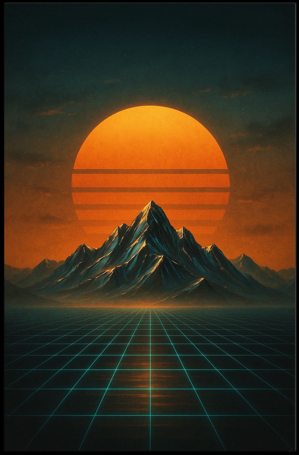 Experience the drama of the 1980s sci-fi revival with a captivating retro-futuristic poster featuring a mountain range silhouetted against a stylized sun, set on a digital horizon grid. The backdrop transitions from deep blue to vibrant orange, simulating a surreal sunset or sunrise. This artwork encapsulates nostalgia while channeling an epic, bold mood reminiscent of electronic music culture. Perfect for fans of vintage and futuristic design, this poster captures the imagination and makes a striking focal point in any modern space.