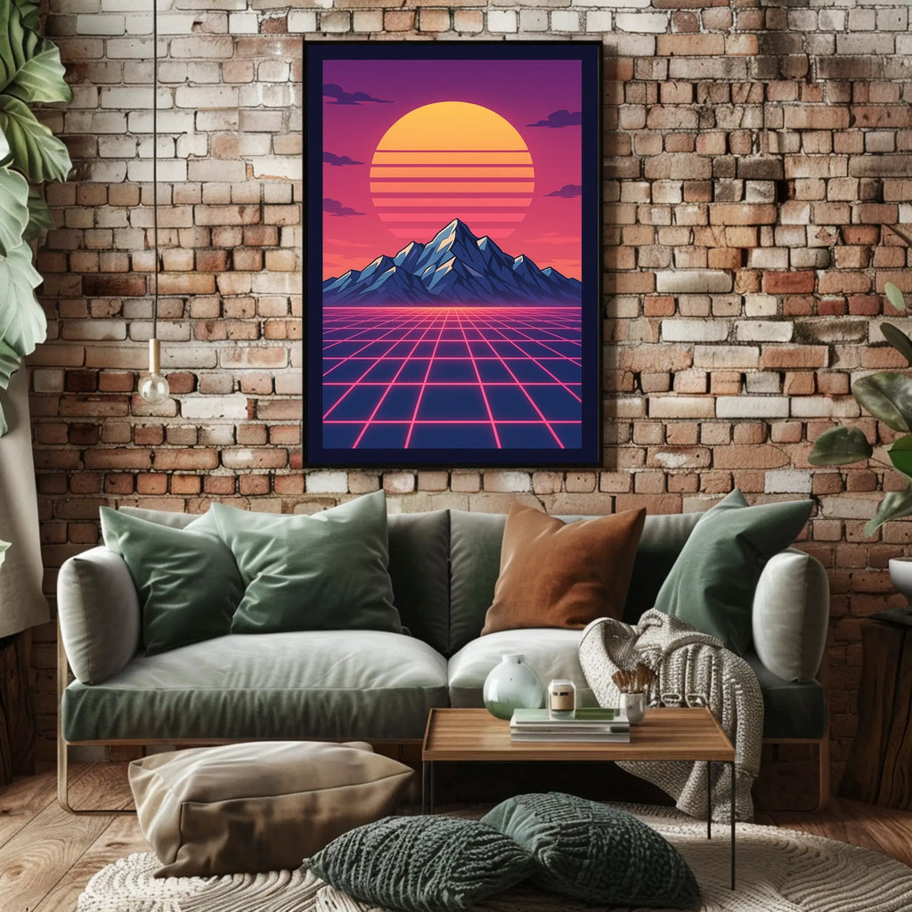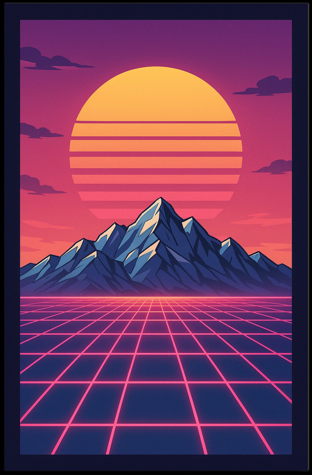 Immerse yourself in the captivating world of retro-futurism as this poster presents a stylized mountain range against a setting sun, accentuated by horizontal lines reminiscent of a digital grid. A vibrant pink foreground with a grid pattern adds depth, while the sky's gradient shifts from deep purple to warm oranges and pinks, evoking nostalgia and a surreal atmosphere.