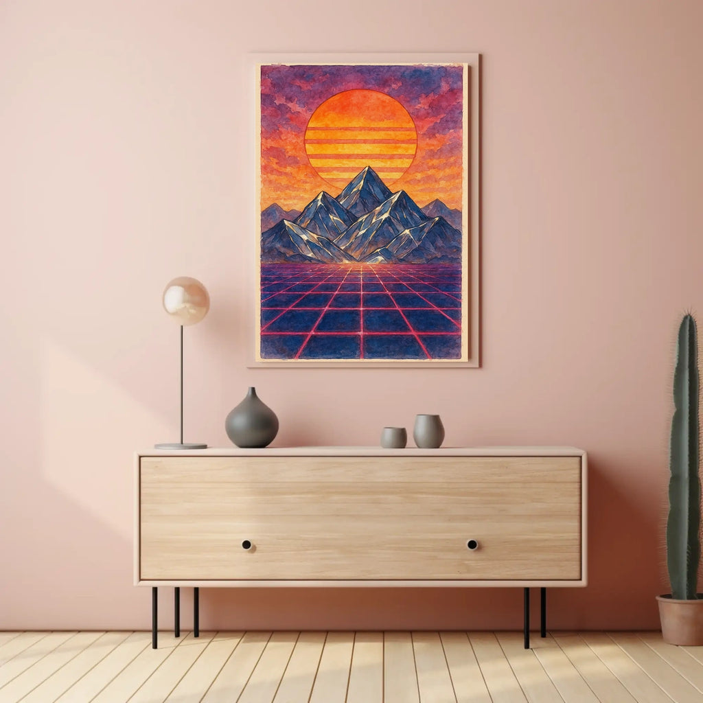 This captivating poster encapsulates a retro-futuristic landscape, characterized by its blend of vibrant surrealistic style and digital motifs. Looming mountains in deep blues and purples create a dramatic contrast against the warm, horizontal-striped sun in oranges and yellows. The foreground's grid pattern, inspired by 1980s digital aesthetics with bright red and pink lines, guides the viewer through the scene, evoking virtual exploration. The dreamy sky, in purples and pinks, adds depth and wonder. Ideal for fans of synthwave art, this piece embodies nostalgia and futuristic allure, merging nature with digital imagination.