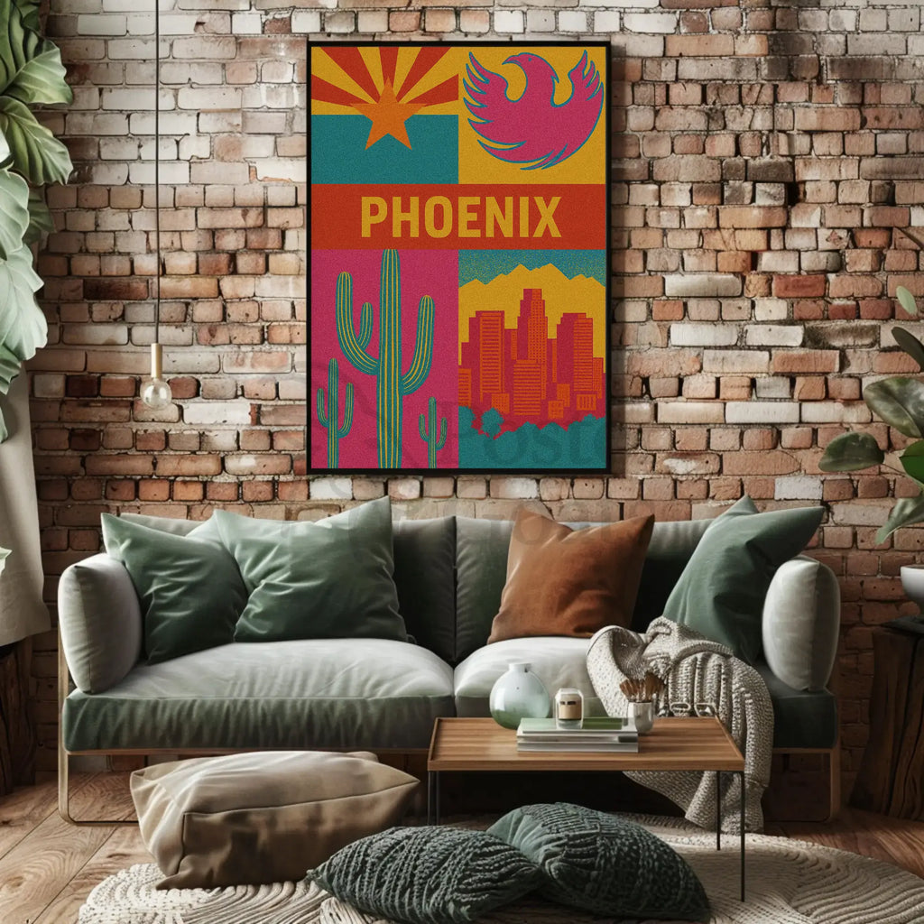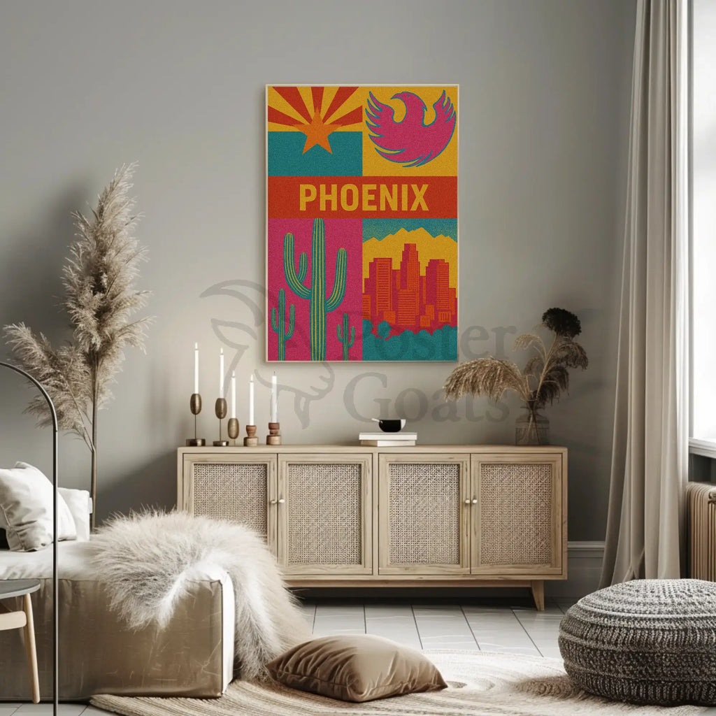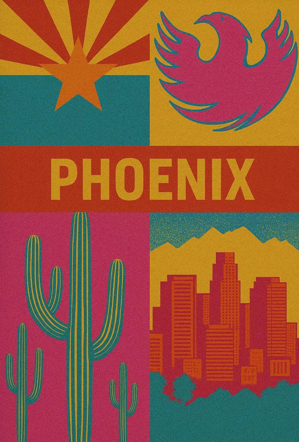 Designed with a bold, graphic style, this poster exudes a textured vintage appearance that evokes warmth and nostalgia. The artwork features a majestic saguaro cactus standing proudly alongside a stylized Phoenix bird, beautifully framed by the urban skyline and the enchanting mountains of the region.
