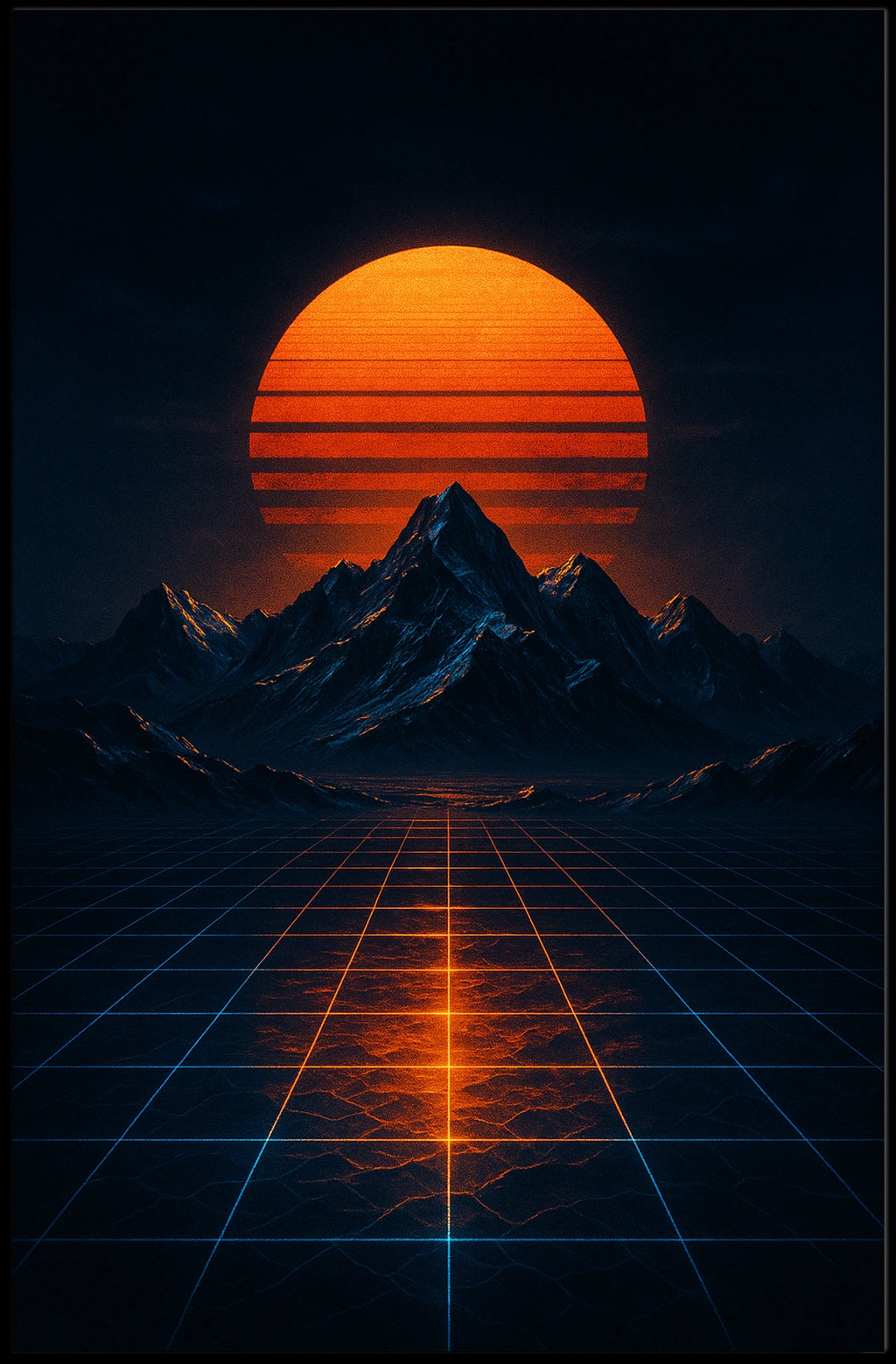 Dive into a mesmerizing blend of past and future with this retrofuturistic poster. Set against a luminous orange sun with striking horizontal lines, the dark, blue-tinted mountains provide a dramatic silhouette. The grid pattern that stretches into the horizon, reminiscent of 1980s computer graphics, reflects the brilliance of the sun, creating a sense of digital nostalgia. Drawing inspiration from synthwave and cyberpunk aesthetics, this artwork marries nature and technology, delivering an otherworldly, bold, and nostalgic mood. Perfect for fans of digital art and futuristic themes, this piece is a standout addition to any space.