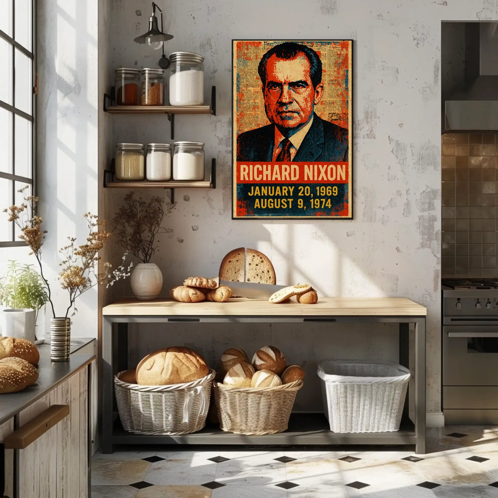 Designed to capture Nixon's iconic presence through a bold street-art mashup, this poster blends classic American politics and history with contemporary flair, making a statement in any room.