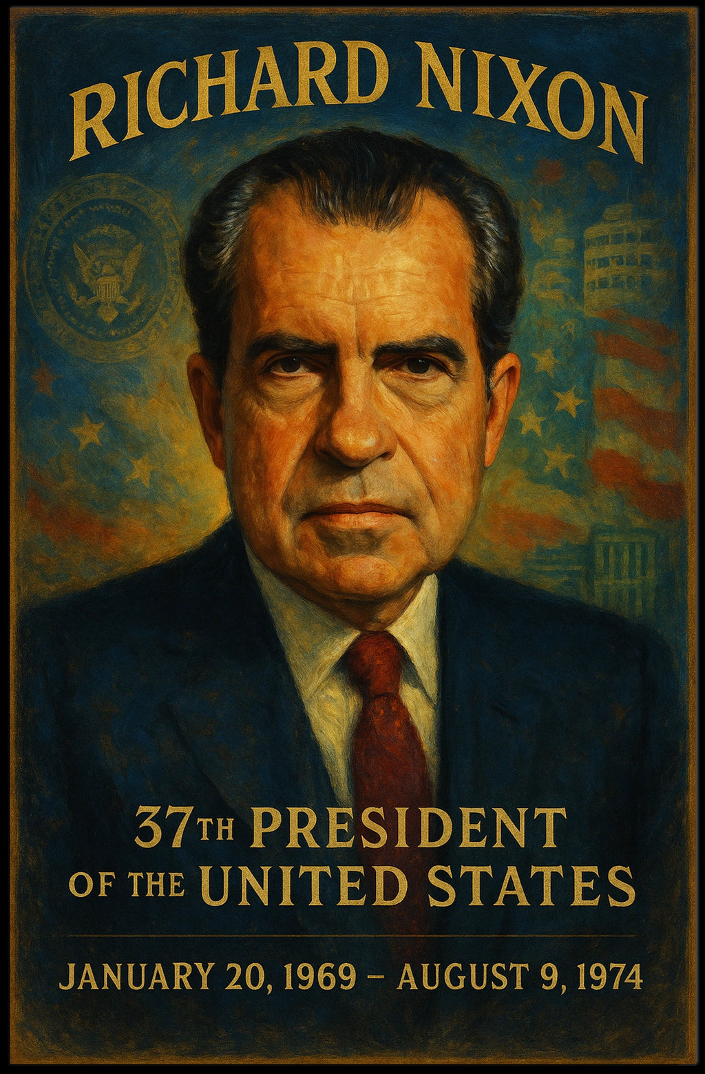 Intro: Celebrate a pivotal era in American history with this evocative poster featuring the 37th President, Richard Nixon. Highlighting his presidency from 1969 to 1974, the artwork captures leadership, diplomacy, and notable milestones, making it a compelling centerpiece for classrooms, offices, or living spaces of history enthusiasts.