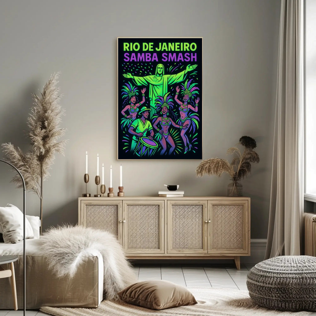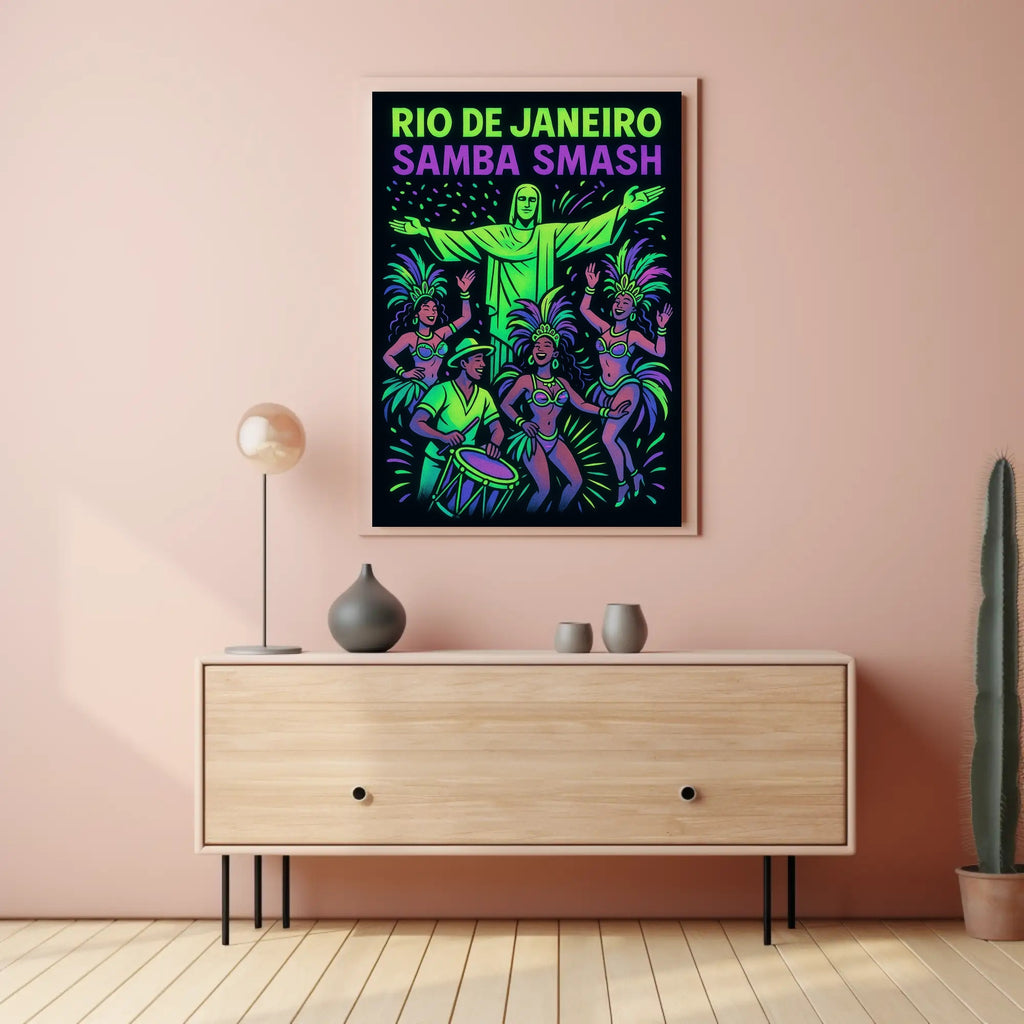 Bring the rhythm and color of Brazil into your home with the Rio de Janeiro Carnival Celebration Travel Poster by PosterGoat. This eye-catching poster features a bold, modern-retro illustration of Christ the Redeemer presiding over samba dancers and a lively drummer — a festive homage to Rio's legendary carnival and Brazilian culture.