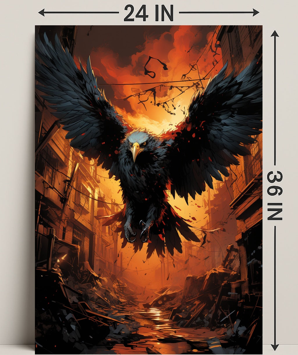 Rise Of The Eagle Poster — a bold, cinematic art print from PosterGoat that brings dramatic storytelling and striking visual energy to your walls. This powerful poster depicts a fierce eagle descending through a fiery, post-apocalyptic cityscape — vivid oranges and deep charcoals combine to create a scene that commands attention and sparks imagination.